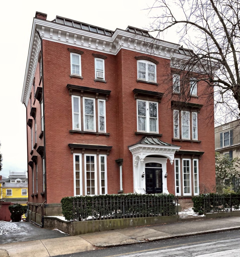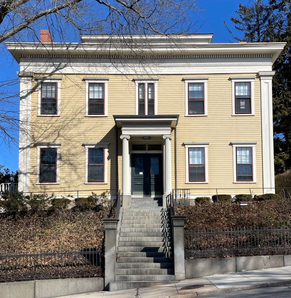 The Ives Rowhouses stand at 270-276 Benefit Street in Providence and are an important and intact example of a Federal period row from the early 19th century. These four, three-story brick rowhouses were built between 1814-19 as investment property for Thomas Poynton Ives, a successful local merchant and partner in the firm of Brown & Ives, who lived nearby on Power Street. Each of the houses has a three-bay facade with pedimented fanlight doorways. The one residence was significantly altered in 1948 by the massive archway for vehicular access at the rear. The houses stand out in Providence, as fairly uncommon rowhouses, which never took off quite like they did in Boston and other New England cities. The row is today neighbors with the National Historic Landmark Hopkins House.