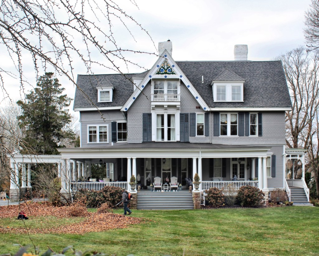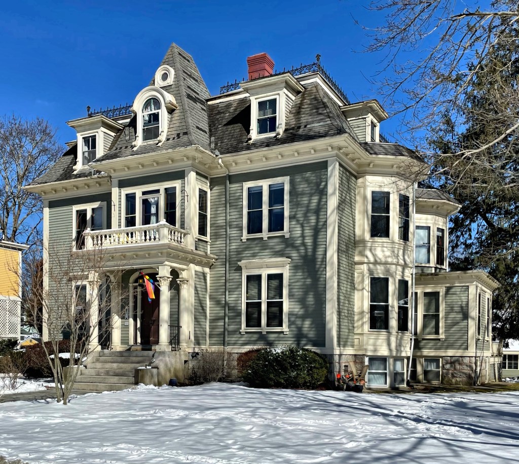 John Brown Herreshoff, a fully-blind ship-builder, and later Founder and President of the Herreshoff Manufacturing Company in Bristol, built this house at the head of Burnside Street, overlooking his boat works (no pun intended). The home sits next to the stunning Codman Place mansion, featured previously, and takes architectural cues from its neighbor. The home is reported to have been built by J.B. Herreshoff, who despite being completely blind, developed his other senses to a high degree to overcome the handicap of sightlessness, and became renowned for his design skills in his ships. The home has a mansard roof with a central projecting entrance bay, capped with a steeply pitched roof, and a barrel-vaulted dormer and ocular window inset. While the house is now condo units, it retains its architectural integrity at the exterior.