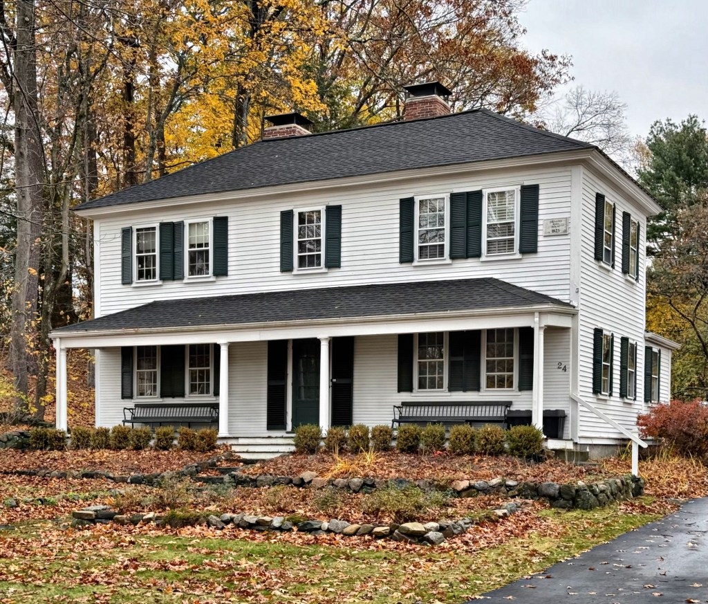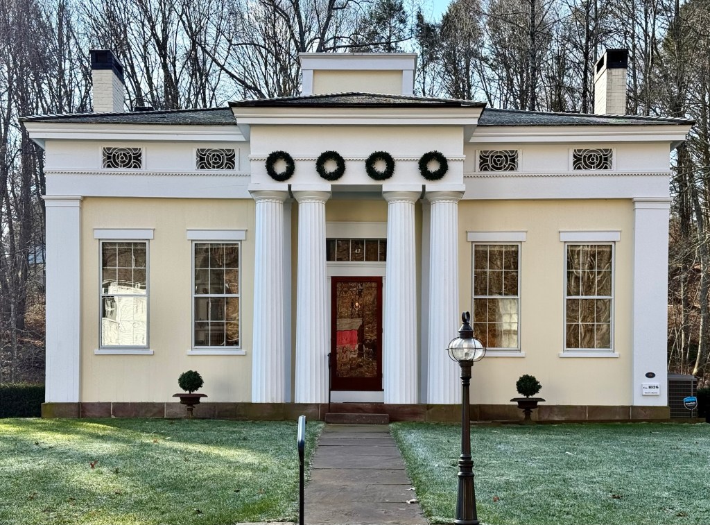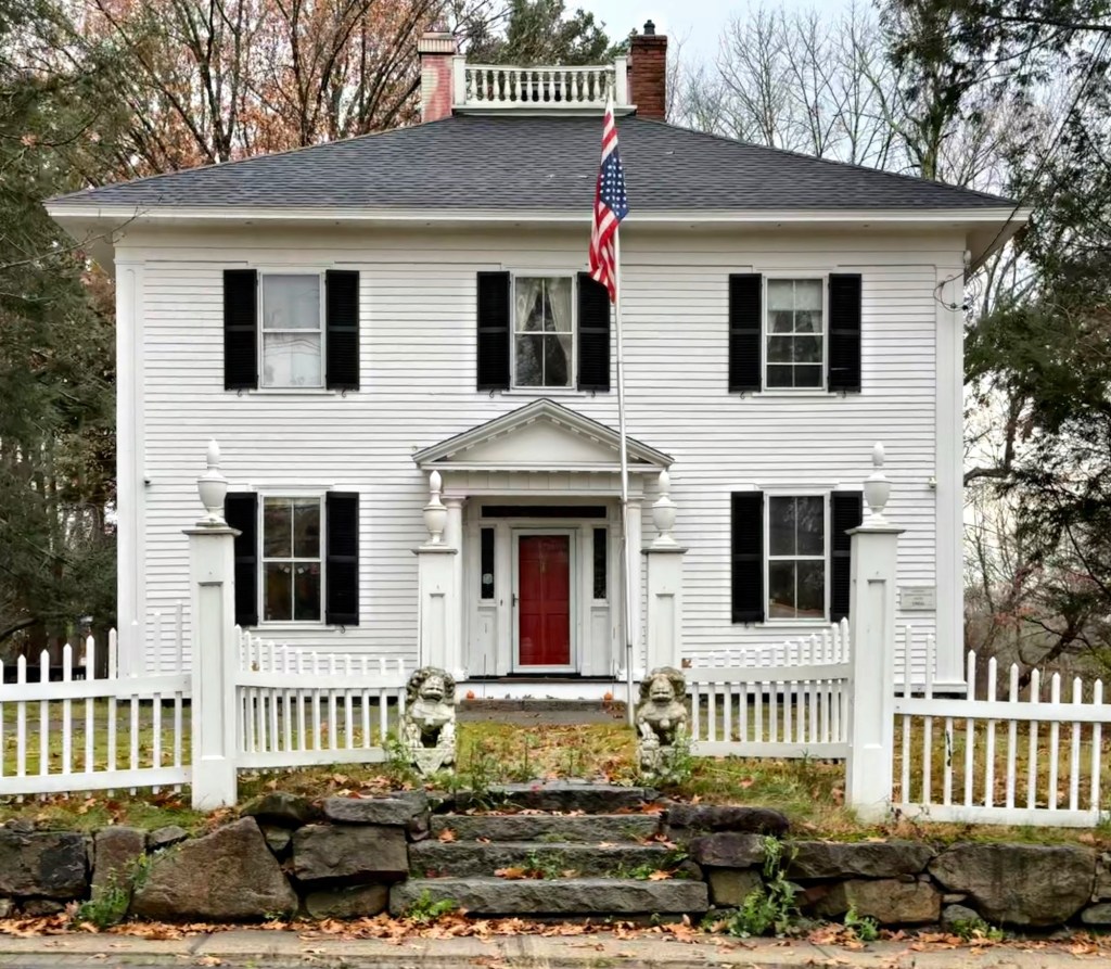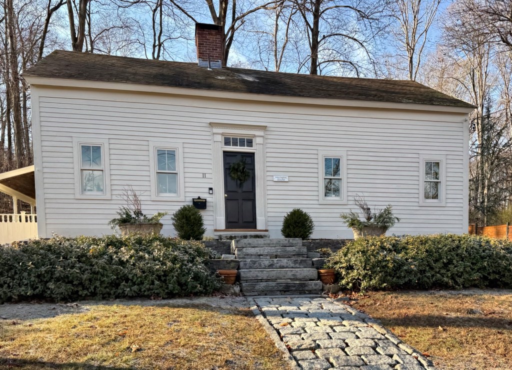 The Charles Daniels House in Chester, Connecticut, is a sophisticated and excellently proportioned and designed example of a single-family residence in the Greek Revival style. Features like the Doric portico, flushboarding and frieze windows are components of a skillful design that has been credited to architect Ithiel Town, but this is unsubstantiated. The home was built around 1826 for Charles Daniels (1799-1838), a gimlet manufacturer, who had his factory nearby. Charles died in 1838, and the property was inherited by his second wife, Abby Gilbert, who also remarried and lived here with her new husband, Clark N. Smith, and they resided here until the early 1900s. Later, the residence was owned by the adjacent mill company, and used temporarily as a storage facility. The location adjacent to the deteriorating factory threatened the significant Daniels House, so in 1978, architect Thomas A. Norton had the house moved a short distance away onto the present site. The house was listed in the National Register of Historic Places and has been preserved, inside and out, by later owners.
