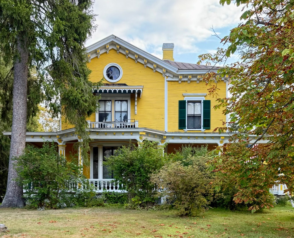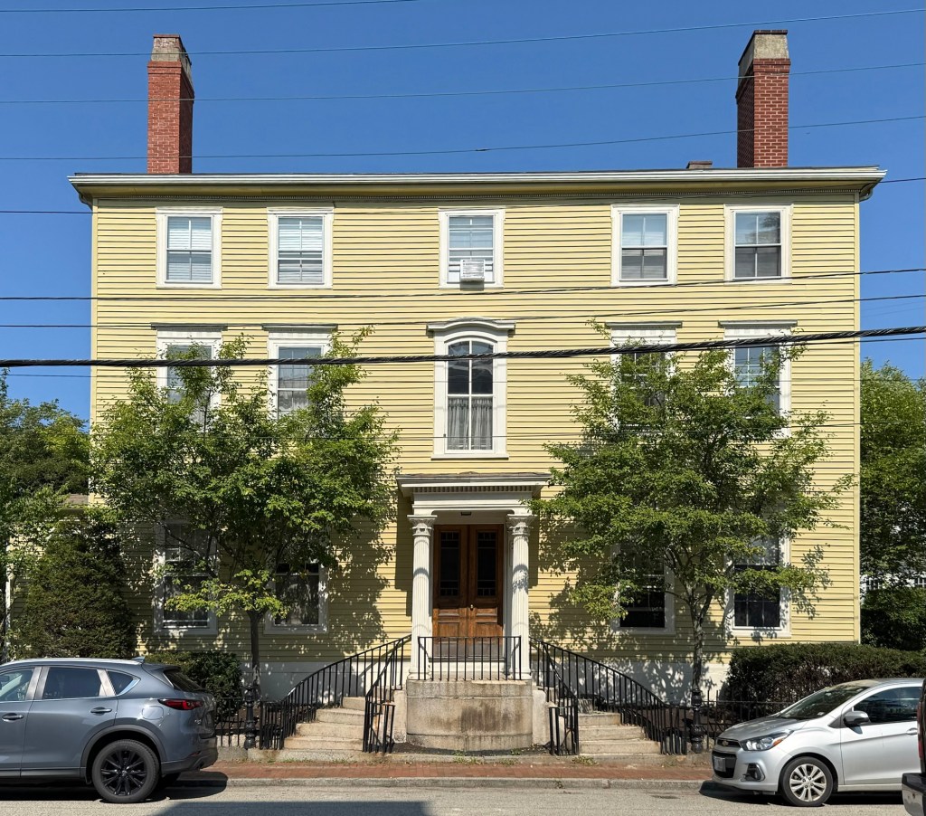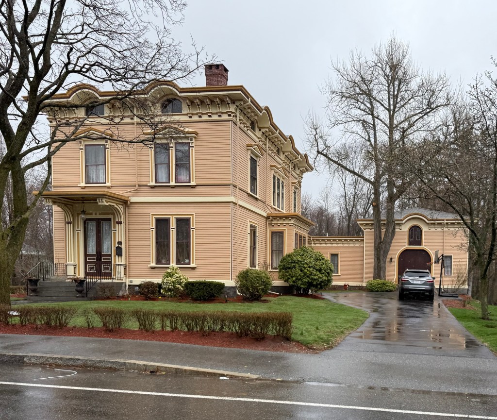 This unique residence in Wayland, Massachusetts, is tucked away on Corman’s Lane, a dead-end street near Snake Brook, a small stream leading into Lake Cochituate. The house was built around 1870 for George William Risley (1836-1913), a shoe manufacturer and Civil War veteran who settled in Cochituate Village and ran a factory there. Risley was active in town affairs and served as Selectman in 1872, the year in which the annual meeting authorized the selectmen to petition the General Court for Cochituate to separate from Wayland. The petition was ultimately never was filed and Cochituate remains a part of Wayland. The Risley House has five bays and a shallow side gable roof with broad, overhanging eaves supported by brackets. A central porch runs along part of the facade and has intricate turned posts and spindlework. The home remains in great shape and is evocative of mid-late 19th century industrial housing built for factory managers.