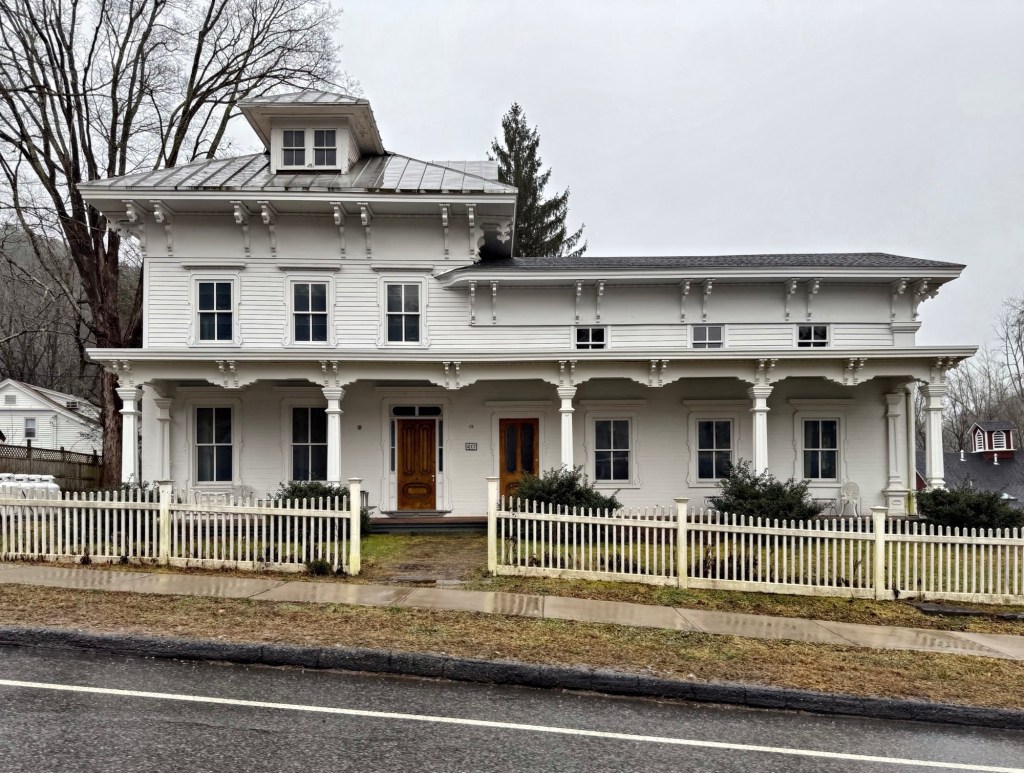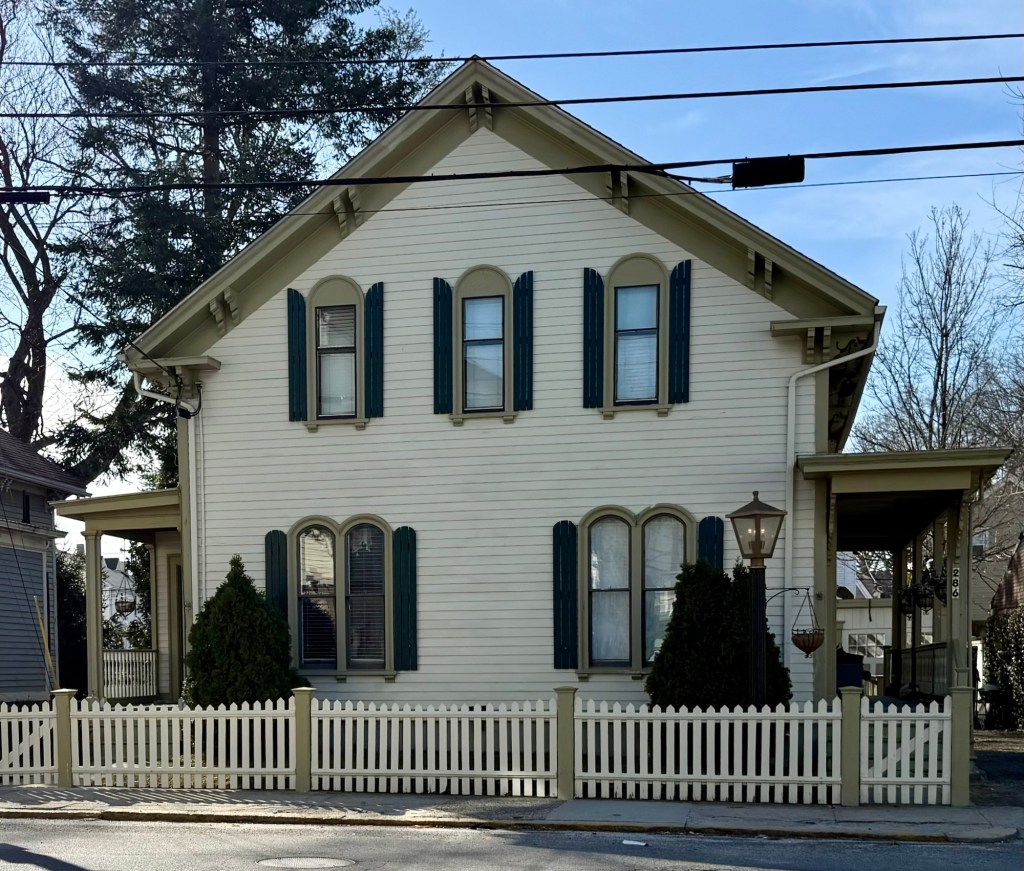This unique residence in Wayland, Massachusetts, is tucked away on Corman’s Lane, a dead-end street near Snake Brook, a small stream leading into Lake Cochituate. The house was built around 1870 for George William Risley (1836-1913), a shoe manufacturer and Civil War veteran who settled in Cochituate Village and ran a factory there. Risley was active in town affairs and served as Selectman in 1872, the year in which the annual meeting authorized the selectmen to petition the General Court for Cochituate to separate from Wayland. The petition was ultimately never was filed and Cochituate remains a part of Wayland. The Risley House has five bays and a shallow side gable roof with broad, overhanging eaves supported by brackets. A central porch runs along part of the facade and has intricate turned posts and spindlework. The home remains in great shape and is evocative of mid-late 19th century industrial housing built for factory managers.