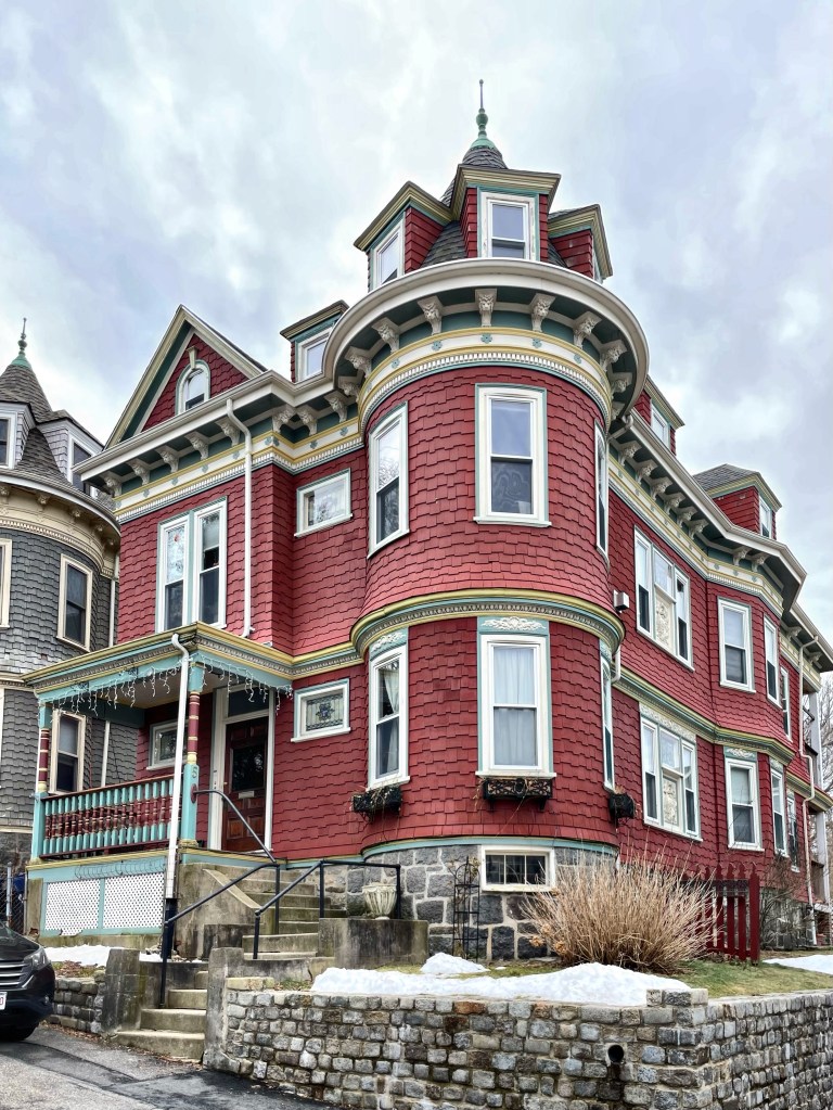 Across the street from the Lannin Triple Deckers (last post) this large triple decker (and the others in the row) was built in 1904 for developer John B. Mulvey. Mr. Mulvey was born in Ireland and migrated to Boston at the age of 16. He climbed his way up the ladder and worked as a builder and developer, largely in Boston-area suburbs and neighborhoods. At the turn of the century, these triple deckers (also known as three deckers) proliferated throughout the Boston suburbs around train stations providing affordable flats to residents. Many were built and rented out by developers, but eventually, owners would live in one unit and rent the other flats for additional income, providing upward mobility and equity, largely benefiting immigrant communities. This high-style example is very well maintained and is a more uncommon double-three decker.