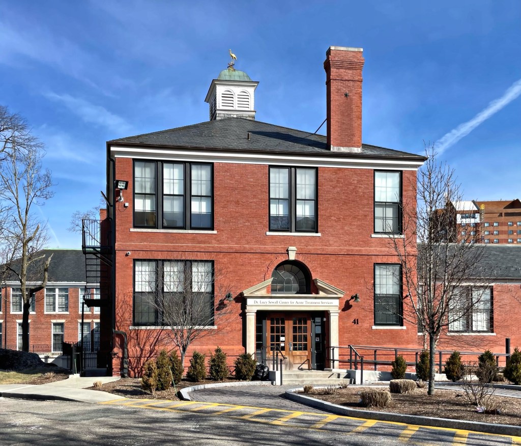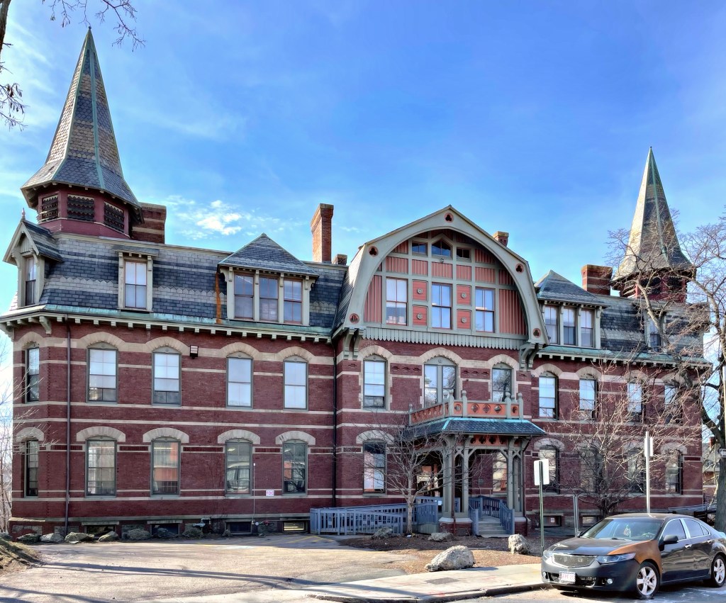 With funds for expansion at the New England Hospital for Women and Children in Roxbury, the hospital’s board commissioned architect Willard T. Sears (also the architect of the earlier Cary Cottage and Zakrzewska Building) to design a new surgical building at the hospital’s growing campus. Construction began on the new Cheney Surgical building in 1899 on the birthday of its namesake, Edna Dow Cheney an original incorporator of the hospital and then President. The Cheney Surgical Building was designed in the Colonial Revival style in brick, with a four-story central block with three-story wings. The central entranceway is accentuated by a classical porte-cochere topped by a Palladian window, in keeping with the Georgian Revival tradition of symmetry and classical vocabulary. The building is one of the first you see when climbing the hill into the campus.