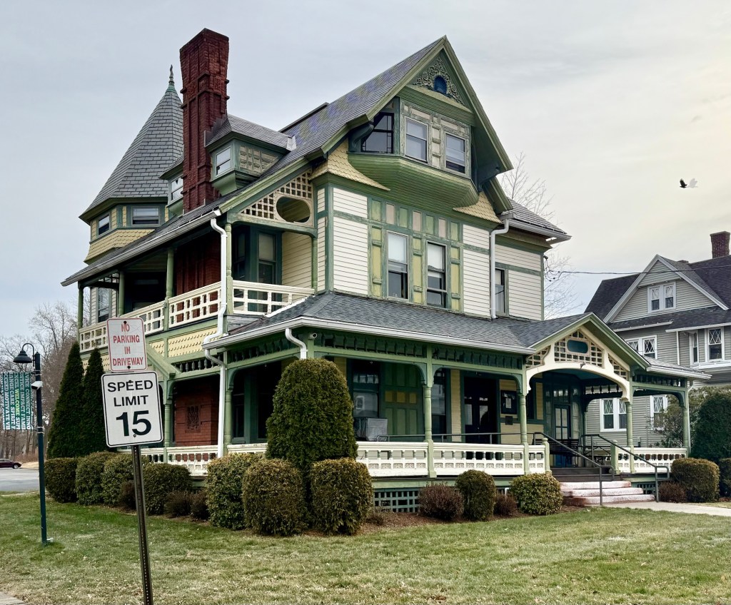 Justin Spaulding and his wife, Sarah (Cooley) Spaulding erected this house on Springfield Street in Chicopee, Massachusetts, in 1886, and would later be known for their philanthropic gifts to their home city. Justin Spaulding (1838-1906) was a wealthy grocer who amassed a small fortune operating stores in the industrial Lower Pioneer Valley. The Spaulding House is one of the finest Queen Anne style buildings in Chicopee, and is notable for its asymmetrical form, tower, ornate gable detailing, porches with original balustrade, and the chimney with inlaid terracotta tiles. Justin Spaulding died in 1906, and Sarah C. Spaulding (1840-1907) would pass away a year later. They had no children. In her will, Sarah bequeathed funds for the first purpose-built library in Chicopee and money for a memorial chapel in a local cemetery. The Spaulding House was acquired by the Academy of Our Lady of the Elms (now Elms College), moved to its present location in 1920, and was converted to the Office of Admissions for the College. Besides the need for a new coat of paint, the house is lovingly preserved!