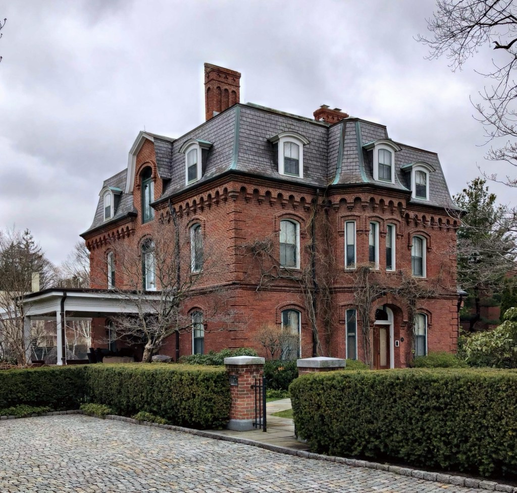 One of the finest Second Empire style houses in Brookline can be found on Prescott Street in the fashionable Cottage Farm neighborhood of the city. Built around 1868 by Amos A. Lawrence, who lived in a house nearby, this “cottage” was rented out to John Wells (1819-1875), a Judge on the Massachusetts State Supreme Court until his death. The property remained in the Lawrence family into the 20th century and was later rented to George E. Bullard, a banker. The brick house is notable for its siting at the center of the lot, corner quoins, brick corbelled cornice, arched door and windows, and slate mansard roof.