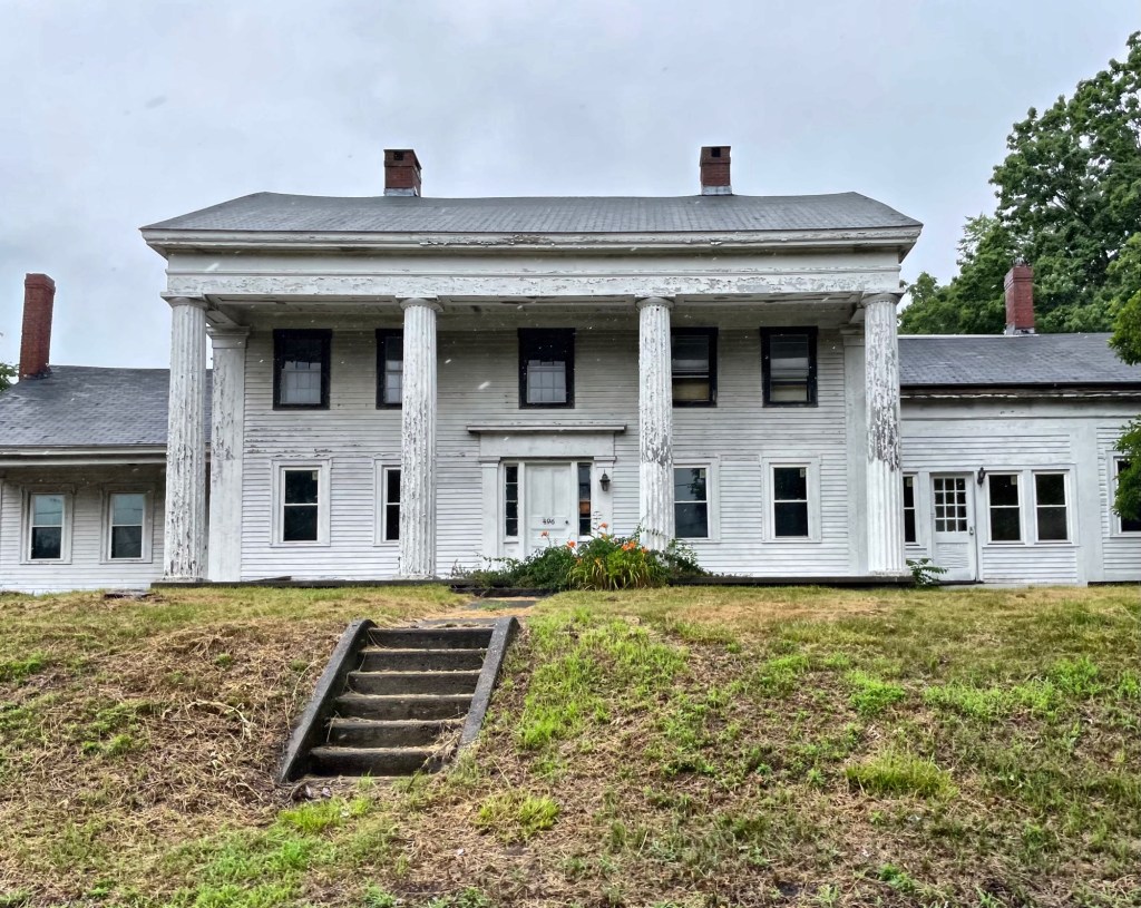 Located in the Dayville section of Killingly, Connecticut, you can find a row of large mansions built for mill owners and managers from the 19th century. This house dates to the 1840s and by the 1860s, was owned by Harris Sayles (1817-1893) and his brother, Sabin L. Sayles (1827-1891) who together, co-owned and operated a large woolen mill in the town (featured previously). It is not clear if the Sayles brothers lived in the home, but they likely rented it to higher-level employees at the mill as they both had other homes in town. The two-and-a-half story mansion is a great example of the Greek Revival style in the town, with the side gable roof extending over the full-height portico with doric columns. The mansion was built across the street from the village church, also in the same style, but that building was demolished by 2011.