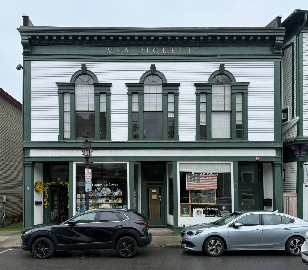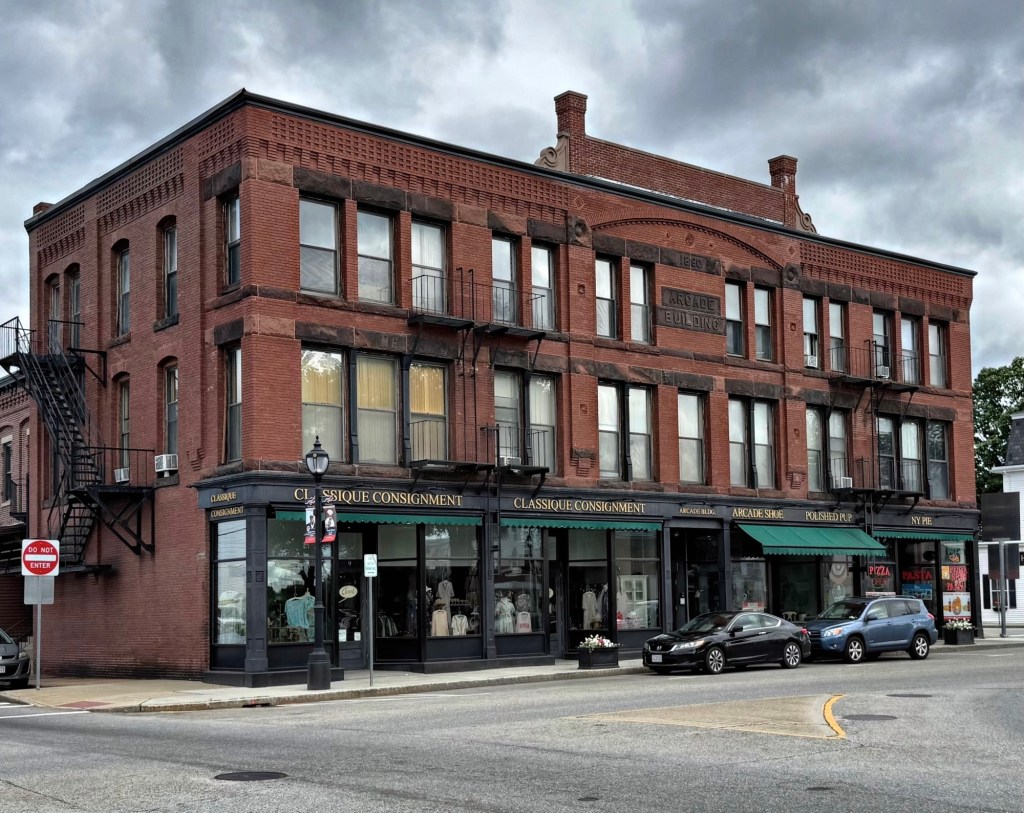 At the junction of West Main and Main Streets in Chester Village, Connecticut, this unique flatiron commercial building stands overlooking the Pattaconk Brook that cuts through the center of town. In 1913, this two-story block was built with ground floor retail and a second floor residence for owner, Elmer Pierce, who ran his pharmacy downstairs. By 1920, the building was owned by Jacob Feinstein, who raised his family on the second floor and had his clothing business, “Feinsteins” in the store below. Later, the retail space was occupied by Child Design, a wooden toy store, and after that, a lighting fixture store. Historic main street buildings are often incubators for small and local businesses, keep the chain stores near the highways!