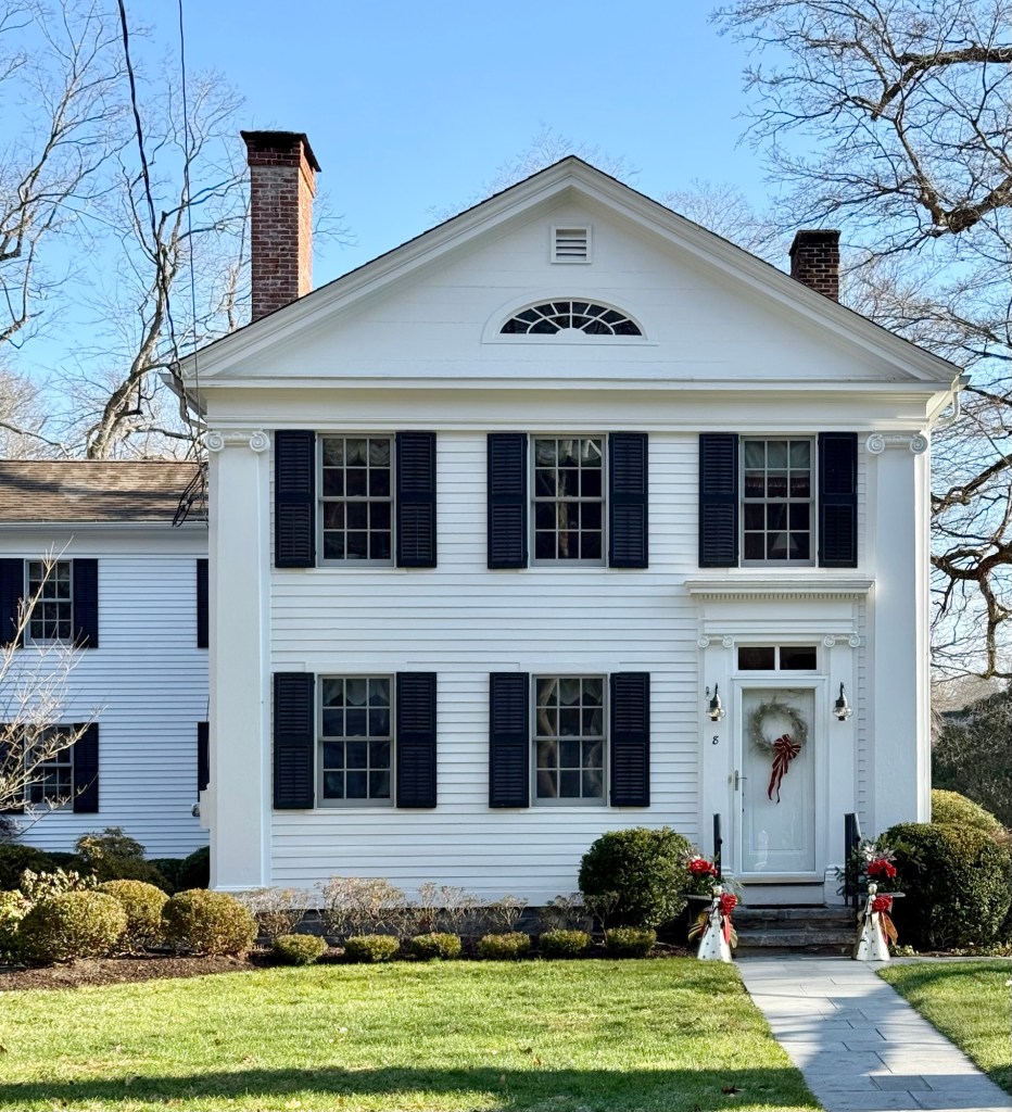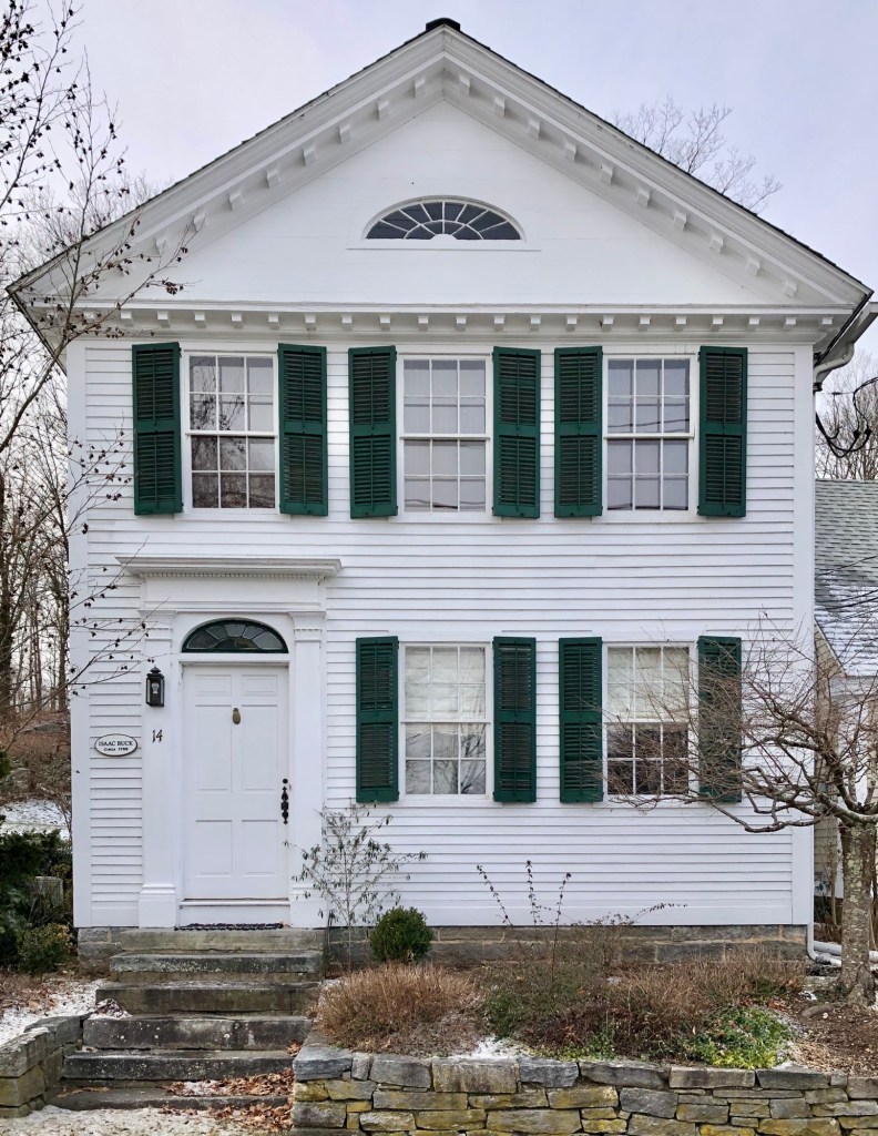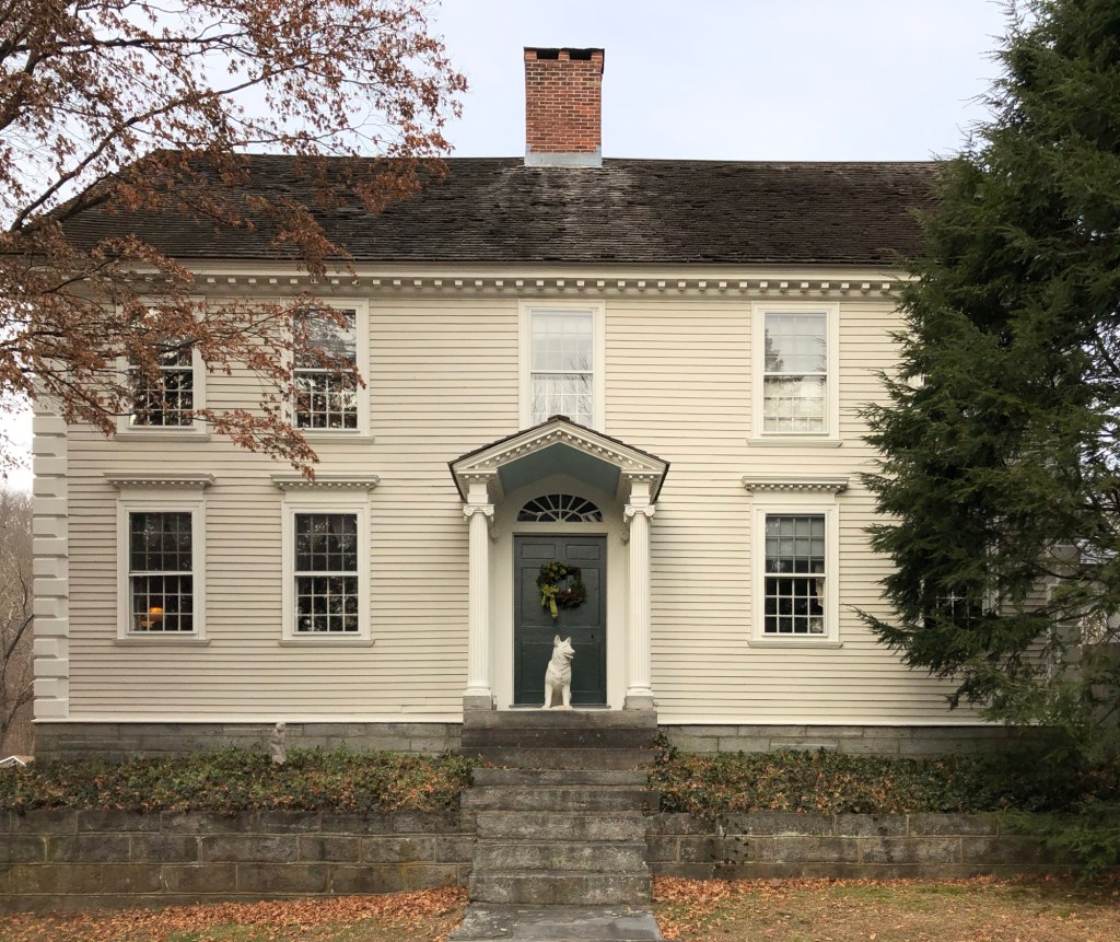 This beautiful Federal style side-hall house is located on Maple Street in Chester, Connecticut, and (at least a part of it) was built by 1755 by Isaac Buck, who deeded half of the property to his son, Justus, during his lifetime. In the early 1800s, the property was purchased by Joshua L’Hommedieu (1787-1880), a manufacturer, who had the property redeveloped or redesigned in the Federal style giving it the appearance we see today. The house has its gable end oriented to the street with an elliptical fan and dentil block detailing.