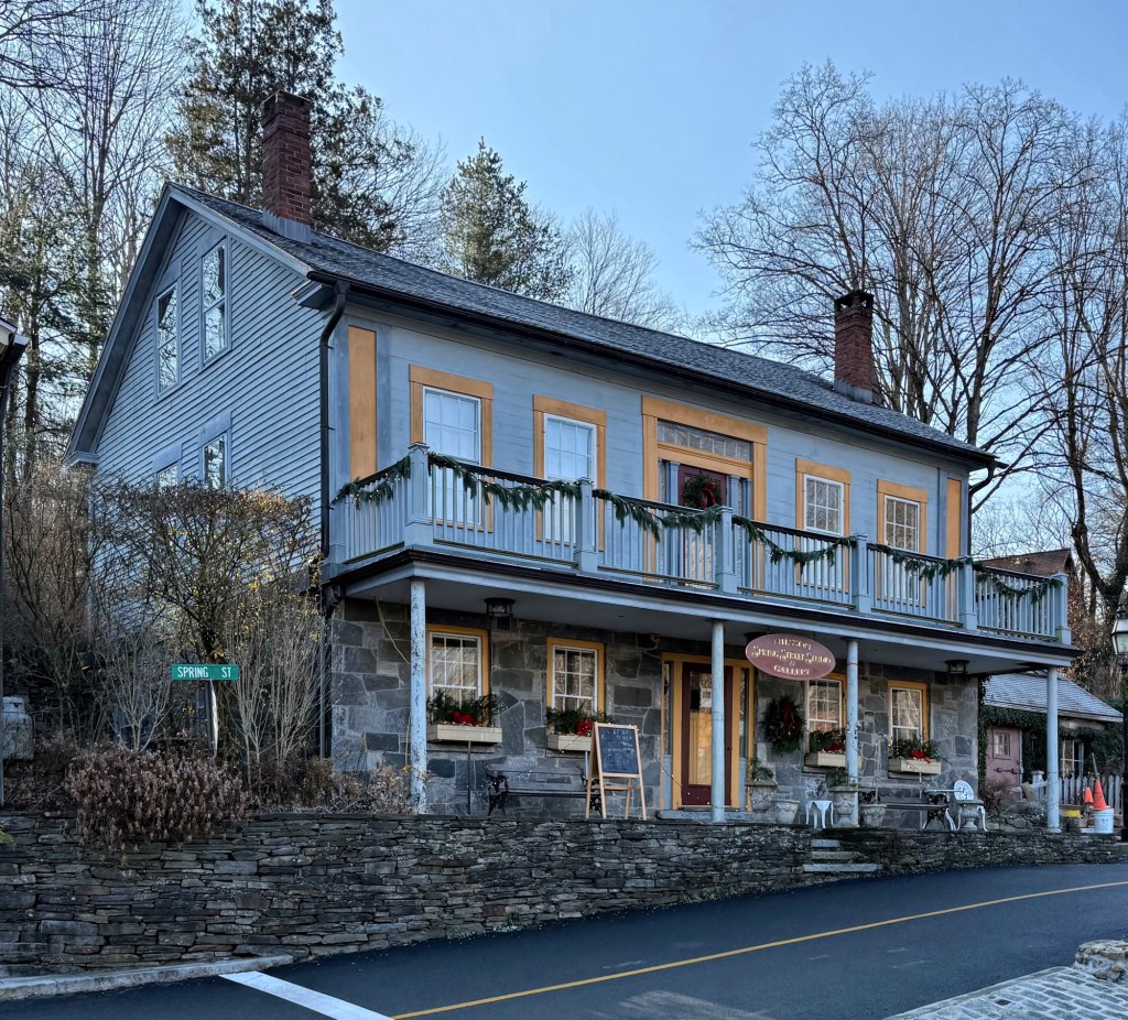 At the junction of West Main and Main Streets in Chester Village, Connecticut, this unique flatiron commercial building stands overlooking the Pattaconk Brook that cuts through the center of town. In 1913, this two-story block was built with ground floor retail and a second floor residence for owner, Elmer Pierce, who ran his pharmacy downstairs. By 1920, the building was owned by Jacob Feinstein, who raised his family on the second floor and had his clothing business, “Feinsteins” in the store below. Later, the retail space was occupied by Child Design, a wooden toy store, and after that, a lighting fixture store. Historic main street buildings are often incubators for small and local businesses, keep the chain stores near the highways!