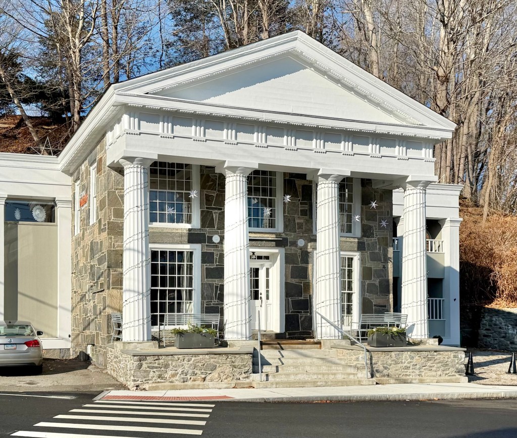 Colloquially known as the “Stone Store,” this handsome stone structure in Chester Village, Connecticut, was built by William Buck in 1809, a merchant involved in the West Indies trade. The stone for the building is believed to have come from the Chester quarry in town and was likely more vernacular without the columned portico. The four-columned Doric portico was likely added in the 1830s or 1840s as the Greek Revival style surged in popularity. The two side wings were added in the 20th century. The Old Stone Store has held various uses from a store, tavern, post office and liquor store, while the upper floor has served as a private school, the town’s library and an apartment. The Old Stone Store today acts as the western terminus of the town’s Main Street commercial district.