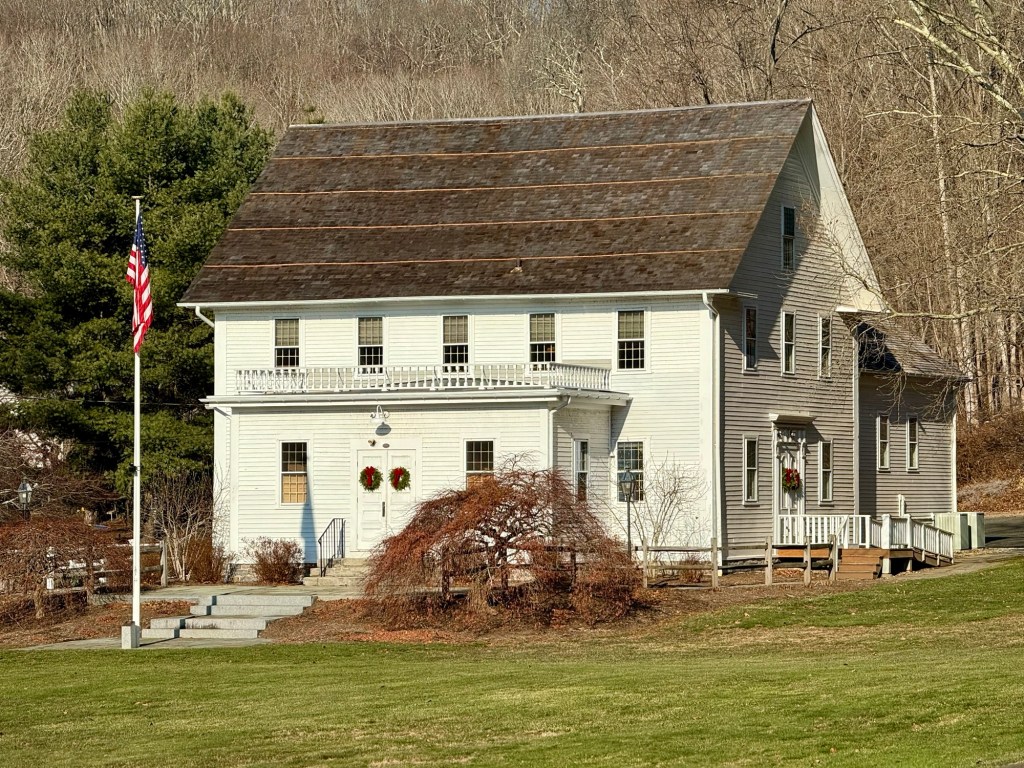 This altered building in the center of Chester Connecticut’s village Main Street, has historically been known as the Chester House, a hotel and tavern to provide lodging and drinks to travelers passing through the area in the mid-late 19th century. The structure, built atop a raised stone foundation, was constructed in the Greek Revival style around 1840, and long had a sheltered two-story portico supported by four monumental columns under a gabled roof which resembled a pediment. In 1903, a fire destroyed the upper floor and the roof was removed, creating a flat roof design. Later in the 20th century, a shallow side gable roof replaced the flat roof and the columns on the facade were also removed, giving the building the appearance we see today. The hotel closed, but the historic structure remains an anchor to the town’s vibrant commercial center, and houses a local business.