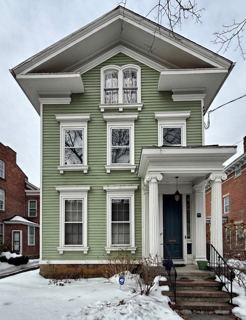 The Phebe Wallace House on Greene Street in New Haven, Connecticut, at first glance, may appear as a typical mid-19th century house, but some of the architectural features and details make it stand out! The residence was built in 1854 for Phebe Barney Wallace (1792-1872), a widow of William B. Wallace who died decades earlier. Phebe lived here with her daughter, also named Phebe, and a servant. The house exhibits a traditional Greek Revival form with gable roof oriented towards the street, with an off-center entry with Ionic portico, but the massive overhanging eaves without brackets with paired arched windows in the gable and balcony off the side of the house showcase the emerging Victorian influence in American residential architecture.