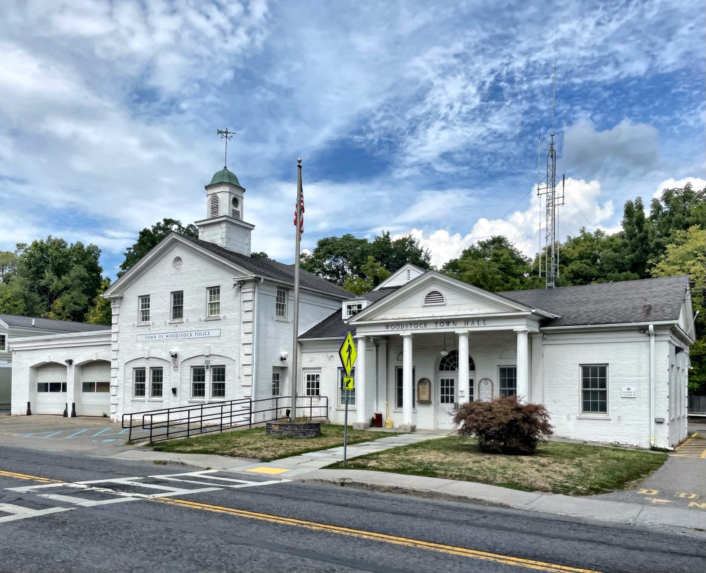 Buildings of New England hits the road! Occasionally, I like to explore and learn about towns and villages in places outside of New England, and one place that has always piqued my interest is Ulster County, NY. One of the more well-known towns in Ulster County is Woodstock, an absolutely vibrant and charming village in the mountains. The first European settlers in the Town of Woodstock were Dutch, along with a few Palatine Germans, who established farms on the fertile land. The town saw some industrial development along Sawkill Creek, but experienced substantial building growth in the early 20th century after the area attracted artists of all types to the area. The village saw population growth which necessitated new city facilities like a town hall and police station. In 1936, construction began on a combined town hall office and police station for the village, in the midst of the Great Depression (possibly using New Deal funds?) The Colonial Revival style building exhibits brick construction with corner quoins, Classical elements like the pediment and columned portico, and a cupola. The only notable alteration since its construction is the infill of the former fire station doors.