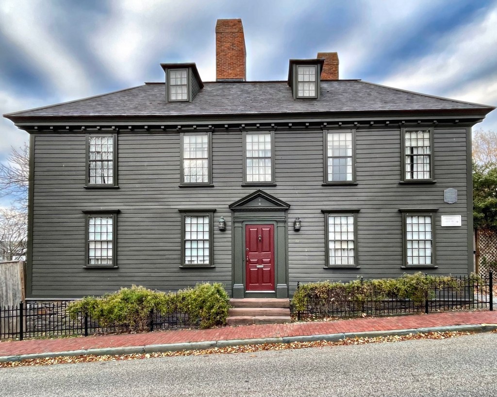 During the height of the Shingle and Queen Anne styles’ popularity, architect Stanford White of McKim, Mead & White completed plans for one of the earliest Colonial Revival style residences, “Sunnyside” in Newport, Rhode Island. The residence was built in 1886 for “Commodore” William Edgar (1810-1887) and his wife, Eliza Lucille Rhinelander (1832-1916). William was a co-founder of the New York Yacht Club in 1844 and heir to a New York fortune. Eliza was an aunt of Edith Wharton and a grand-daughter of William Rhinelander, co-founder of the Rhinelander Sugar Refinery. The property remained in the Edgar Family as Lucille Rhinelander Edgar (1858-1948), an unmarried daughter of the couple, would live here year-round with servants. The house is built of buff-Roman-brick with a large central block flanked by L-plan wings under a hipped roof punctuated by massive chimneys. Of special note on the facade are the rounded bays, entry portico with Palladian window above, and side porch.