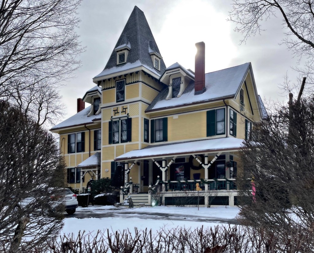 Andrew F. Leatherbee (1842-1920), a wealthy lumber dealer in Boston, built this large Stick style victorian house in Newton Center around 1870, likely using his own lumber products! The large frame house is prominently sited on a corner lot on Beacon Street, a short walk to Crystal Lake, a natural pond in the center of town. I could not find information as to who the architect was, but it was likely a notable local firm. As Andrew got older, he downsized and relocated to a smaller apartment in Cambridge. Upon his death in 1920, the property was sold by his heirs to Mae Van Dusen. The house is a high-style example of the Stick style of architecture, with large half-timbers, heavy porch bracing, and a central tower with pyramidal roof. Swoon!!!