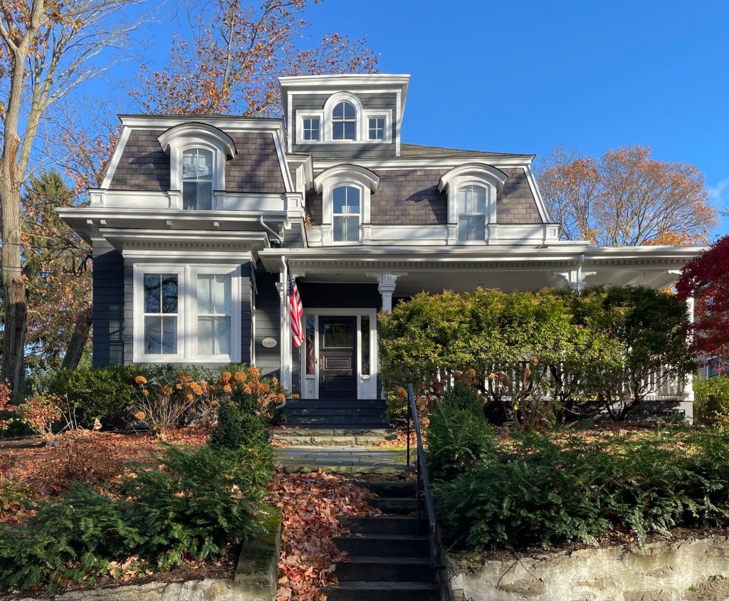 While most of the early homes in Newton Centre were built by a few landowners and rented to tenants, this charming Mansard cottage was owner-occupied from the start. Tucked away on the quiet (and appropriately named) Pleasant Street, the George Cobb House is one of the most beautiful old Victorians in the neighborhood. An early resident was George Washington Cobb (1840-1925) was a druggist who ran an apothecary in East Boston, and he made the long commute there every day from this house. The property has a mansard roof with pedimented dormer and three-story tower capped by a bell-cast mansard roof. Paneled pilasters and brackets add a lot of detail to the primary facade.