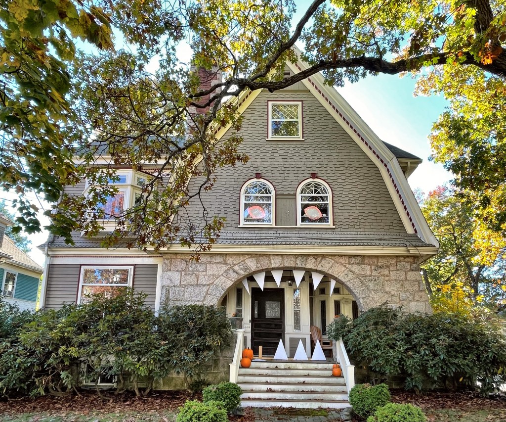 Happy Halloween! To celebrate I wanted to feature one of the more creatively decorated houses in the Boston area, which blends spookiness with architecture! This is the Barrows-Goddard House, so named after its first two owners. The house is located in Newton and was built in 1898 as an eclectic Queen Anne/Shingle style home. The original owner was Joseph Barrows, who developed the property and sold it within a year, relocating to a new home on a less busy street. The property was owned next by Christopher Goddard, an insurance agent with offices in Boston. Architecturally, the gable roof of the main block is intersected by an over-scaled gambrel cross-gable clad in patterned cut wood shingles. The focal point of the design is the Syrian-arched entrance porch of coursed, dressed fieldstone which this time of year, eats trick-o-treaters!