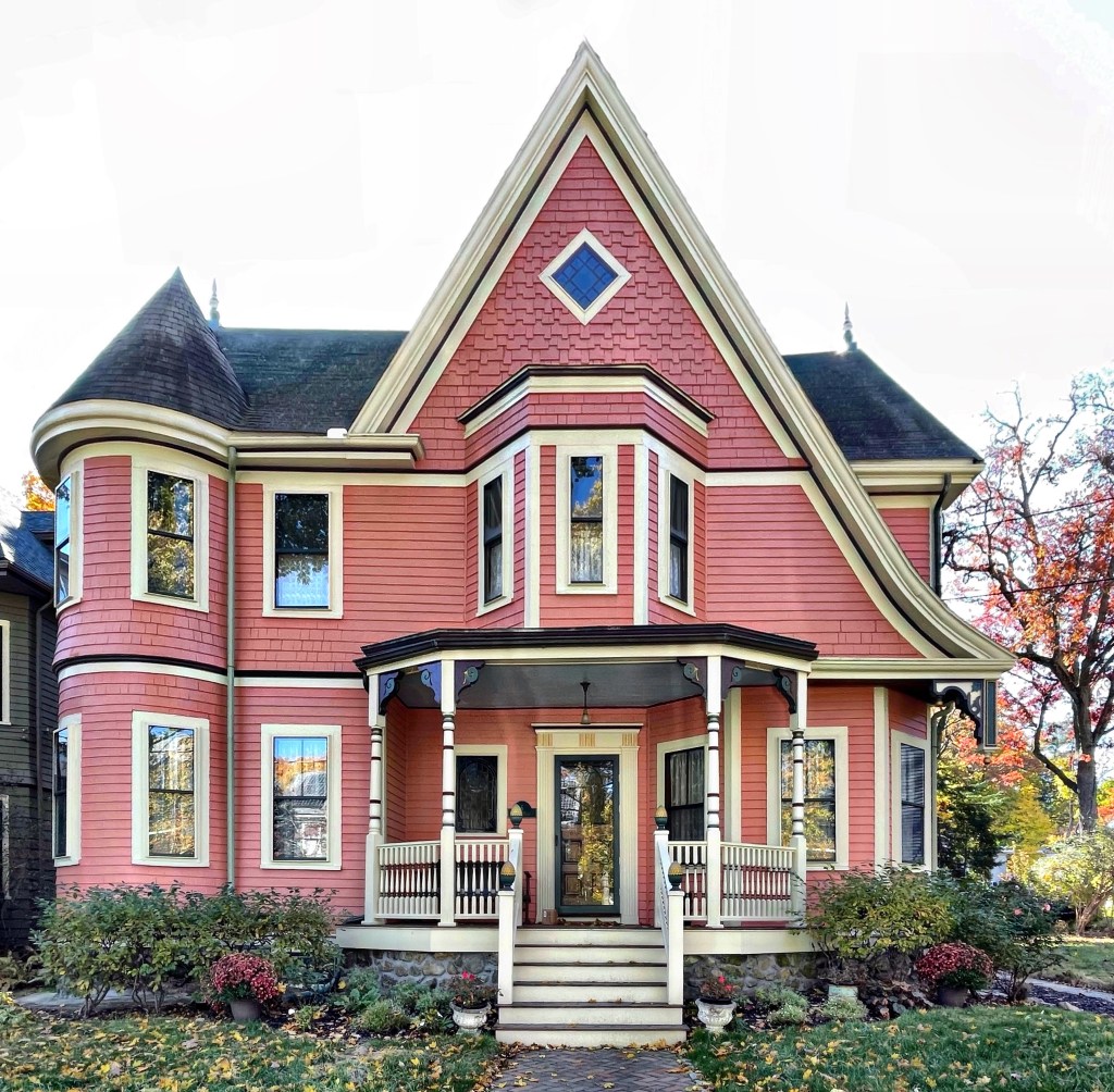 Behold this Queen Anne painted lady in all her glory! This home was constructed in 1898 as a late Victorian addition to Newton’s built landscape. The home’s earliest known owner was a T. C. Sullivan, who left the property to his family upon his death. The house is painted some pretty bold colors, which does an effective job at highlighting the many architectural details and intricacies in the design, but the home would have never been painted like this historically. A little history lesson: the “painted lady” trend took off in San Francisco when after WWII, disinvestment in the urban core led many Victorian homes there to be demolished, altered and covered with siding, and many were painted gray with war-surplus Navy paint (battleship gray). In 1963, San Francisco artist Butch Kardum began combining intense blues and greens on the exterior of his Italianate-style Victorian house. His house was criticized by some, but other neighbors began to copy the bright colors on their own houses. Kardum became a color designer, and he and other artists / colorists began to transform dozens of gray houses into Painted Ladies. By the 1970s, the colorist movement, as it was called, had changed entire streets and neighborhoods. This process continues to this day. The trend took off all over the United States as urban centers saw re-investment and gentrification. While not historically appropriate, the Painted Ladies can really make people happy and show pride in ownership.