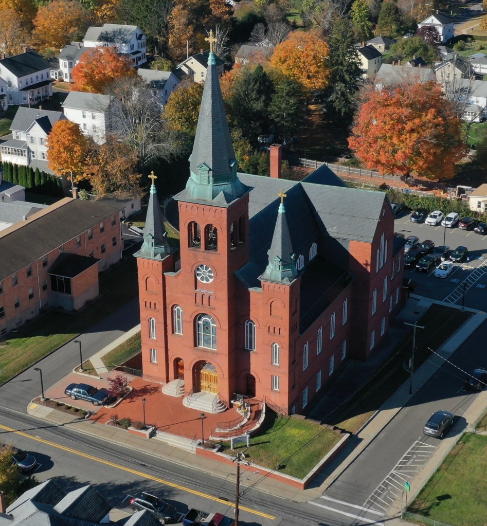The Basilica of St. Stanislaus is a landmark church building in Chicopee, Massachusetts, with strong ties to the city’s industrial and immigrant past as well as a landmark of the city’s rebirth and growth. The congregation was founded and financed by Polish immigrants who had arrived in Chicopee, beginning in the 1880’s. The young Poles were determined to establish and finance their own church in which they could worship in their own native language and espouse their Polish customs and traditions with a sense of community. The church was founded at a time where Polish immigrants were settling in Chicopee, finding work at local factories. The Polish population of Chicopee surged in the late 19th into the early 20th centuries from just 200 residents in 1885 to over 9,000 in 1914. The first St. Stanislaus Church was a small frame structure built on this site in 1891. The present church was built in 1908 from the designs of architects Robert J. Reiley and Gustave E. Steinback and is Byzantine Revival in style. Constructed of brownstone with cathedral-like qualities, the facade is dominated by a pair of monumental masonry towers. Its spires are composed of copper drums which are surmounted by graceful belvederes and are pierced by arched openings. In 1991, Pope John Paul II raised the status of the church to a “minor basilica“, a classification that remains to today, one of just a handful in New England.