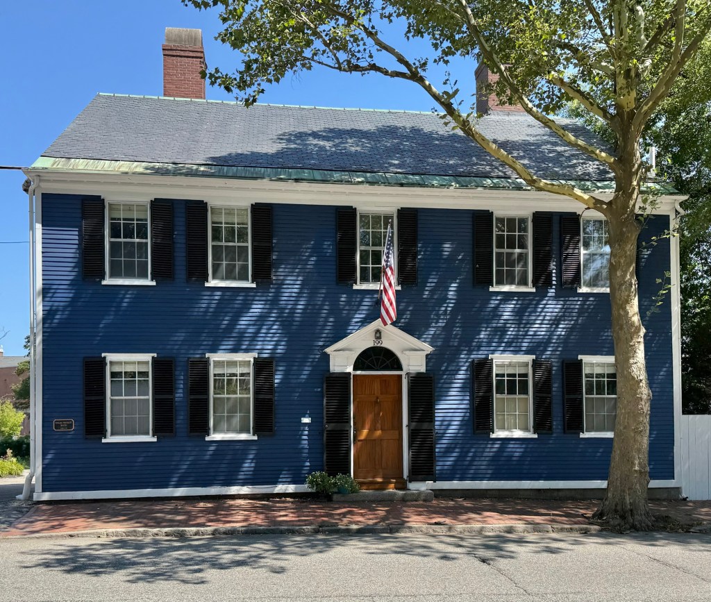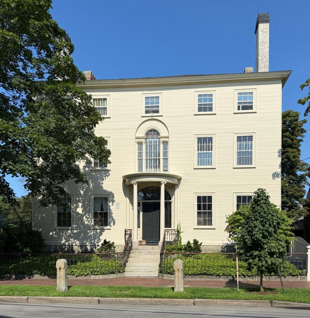 The Larkin-Ladd House at 180 Middle Street in Portsmouth, New Hampshire, is a three-story, masonry Federal-style residence with symmetrical facade, built for one of the city’s wealthiest merchants. Samuel Larkin (1773-1849) was born in Charlestown and moved to Portsmouth, marrying Ann Jaffrey Wentworth, a daughter of Col. Joshua Wentworth. During the War of 1812, Samuel Larkin made his fortune as an auctioneer, selling the contents of English ships captured by local privateers. It is believed that fourteen privateers and their crews worked out of Portsmouth Harbor and are said to have captured an estimated 419 British ships! With the profits from stolen goods from these British ships, Larkin purchased lots on Middle Street and began construction of this stately residence. He (and mostly his wife), had twenty-two children, although roughly half of them died before reaching adulthood. By the late 1820s, financial hardship fell on Larkin and he sold this property, moving into his house next door, which before this was his original residence and later rented to boarders. The Federal style mansion was later owned by Henry H. Ladd, a prosperous Portsmouth shipping merchant, who also served as President of New Hampshire Bank and Portsmouth Savings Bank. The Larkin-Ladd House is undoubtedly one of the finest Federal style residences in New England, and stands out for its entrance, flanked by Palladian windows and the slightly recessed elliptical surrounds at the first and second floor windows. Additionally, the historic stable, also from the 1810s, maintains much of its architectural integrity.