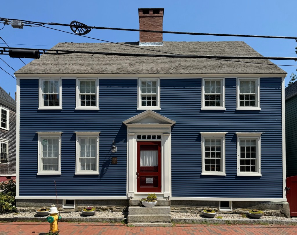Before wealthy Portsmouth merchant and auctioneer, Samuel Larkin (1773-1849), built his brick Federal style mansion (last post), he lived in this more traditional Federal style house next door at 160 Middle Street. The three-story mansion was occupied by Samuel Larkin, his wife, Ann, and seven of their children who lived to adulthood, before the War of 1812, when he made his fortune auctioning goods stolen from British vessels by Portsmouth privateers. When he built his home next door, he retained ownership of this home, and rented it out to boarders until financial hardship in the late 1820s required that he sell his mansion and move back here to live out his retirement. The facade of the Samuel Larkin House is symmetrical with a central entrance door with fanlight and pilasters under a flat-roof portico supported by fluted columns with scrolled capitals.