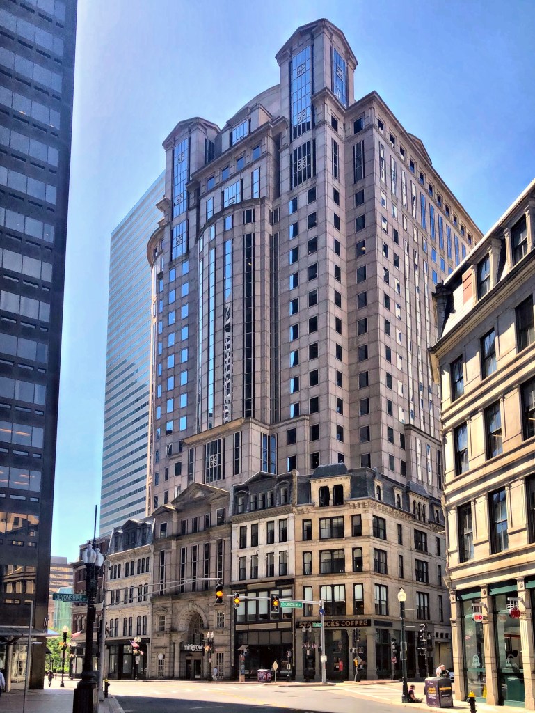 1974, and occupied by the bank in 1977. Designed by the firm Hugh Stubbins & Associates, the complex occupies a full city block, with the 32-story tower and a 4-story section serving as the bulk of the mass. A 600-ton major steel structure called a “truss” marks the beginning of the tower’s offices above the breezeway. The exterior is natural anodized aluminum, which acts as a curtain wall and weatherproof facing. The aluminum spandrels or “eye-brows” shade the building interior from the sun in the summertime and allow more sunlight in the winter months. Love it or hate it, this building is extremely significant architecturally for its Modern design and materiality, and for its engineering. It has become a visual landmark and anchor into Boston’s dense Downtown.