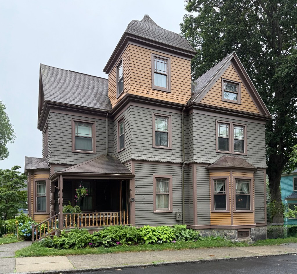 The John Runkle House on High Street, is one of the most interesting houses in Brookline. Built in 1875 for educator John Daniel Runkle (1822-1902), the brick residence excellently blends early Queen Anne form and flourish with Victorian Gothic design elements all with Stick style entry porches and dormers. John D. Runkle was a noted mathematician who later became the second President of the Massachusetts Institute of Technology from 1868 until 1878. This occurred before MIT moved over the Charles to Cambridge, so President Runkle would not have traveled far to the Institute when located in the Back Bay. The Runkle House was designed by the architectural firm of Weston & Rand with an irregular plan of elaborate belt courses in the brickwork that is set against the extremely steep slate roof with tall prominent chimneys and corner turret. Sadly, the residence is largely obscured by a tall wooden fence, but I caught it on a good day that a panel was down.