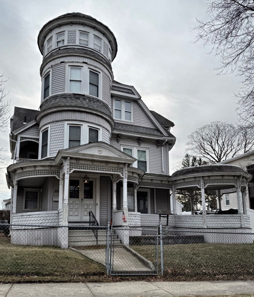 This fancy Queen Anne Victorian residence can be found in Chicopee Falls, Massachusetts, and is one of the most unique houses in the industrial city. This property was built and occupied by David B. Griggs, a builder in Chicopee under the firm D. B. Griggs & Sons. The firm was very busy in the late 19th and early 20th centuries, as Chicopee saw rapid industrial prosperity followed by a population boom, growing in population from over 9,000 residents in 1870 to 36,000 in 1920. Builders like David Griggs were able to grow to upper-middle class and buy property on desirable house lots and build large homes for their family, as was the case here. David Griggs died in 1896, five years after his home was built, and the property was inherited by his son, Millard Griggs. While the residence is covered in vinyl siding (original siding and trim is likely underneath the present siding), the house retains much of its original fabric including the brackets, delicate open friezes at the porches, and four-story tower.