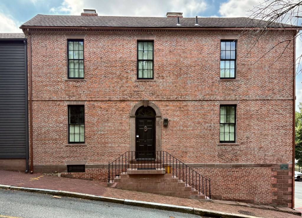 The Benoni Cooke House at 110 South Main Street in Providence, Rhode Island, is one of the finest examples of an architect-designed Federal style residence in the state. A fine and somewhat-typical example of architect, John Holden Greene’s 1820s work in the Federal style, the residence is actually the remaining half of what was originally a pair of mirror-image houses, built for two brothers-in-law and business partners, which once faced one another across a driveway leading to a large, well-preserved service court defined by connected stables (most of which remain). The mirror house, built for Rufus Greene, was demolished in 1895 for the expansion of the Old Stone Bank next door. The Benoni Cooke House was built in 1828 and sits atop an arcaded basement on the street elevation, which historically was used for commercial use. The Cooke House retains its iconic hipped roof with monitor (common for John Holden Greene’s works), an Ionic portico sheltering the entry with sidelights and fanlight transom, and elaborate stairhall window above. The building was later occupied as offices for the Old Stone Bank, and along with the Old Stone Bank, was acquired by Brown University, who sold the property in 2009 to an LLC, but its current use is unclear.