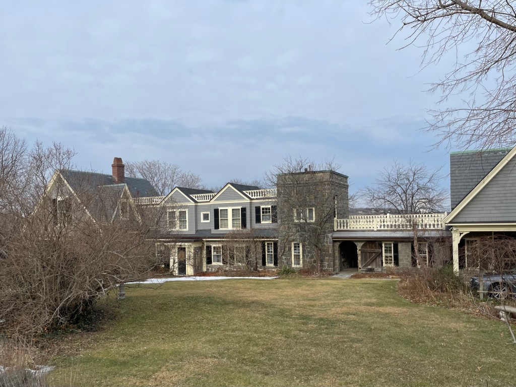In 1892, this large summer “cottage” was built in the Land’s End section on the coast of Rockport, Massachusetts. The large summer residence was built for the Thatcher sisters of Roxbury and was named “The Billingsgate” after their mother’s maiden name, Billings. Caroline Billings Thatcher would summer here with upwards of her four other sisters, Lillian, Margaret, Mary, and Elizabeth, to escape from the city. The large summer cottage features a rubblestone first floor with stone columns supporting the shingled floor above. A large gambrel roof and dormers punctuate the façade and showcase the simplicity and elegance of the Shingle style.