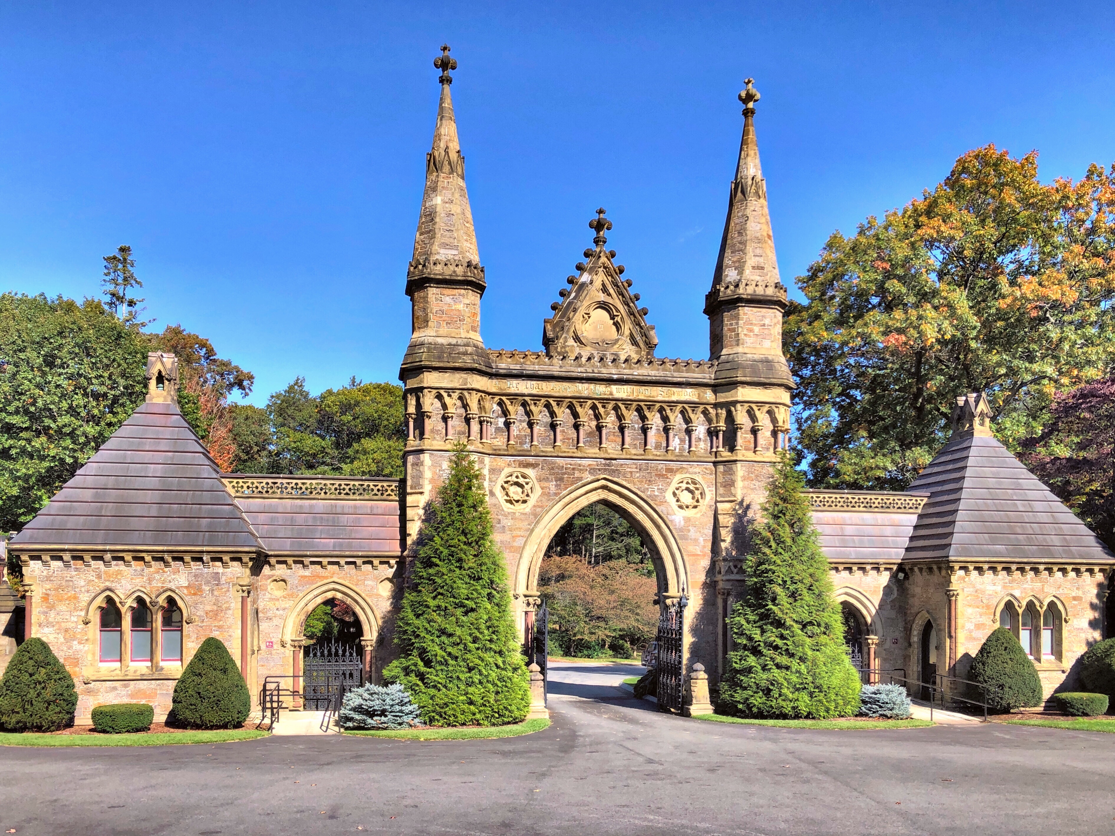 Located in Fountain Hill Cemetery, which has become a sort of Rural Cemetery in the small town of Deep River, Connecticut, this handsome gothic chapel graces the entrance and has provided a place of solemn memorials and celebrations of life for over 100 years. The Fountain Hill Cemetery was originally established in 1851, but after a half-century of use, Miss Mary McCellan Wooster (1839-1911), sought a non-denominational chapel for the grounds to not only beautify the local cemetery, but provide a place to honor the dead. In her will, Miss Wooster left $10,000 for a new chapel. The cemetery board of directors hired architect, Isaac Allen, Jr. of Hartford, Connecticut, to design the structure. The Neo-Gothic chapel was built of local stone and opened to the public in April 1915.