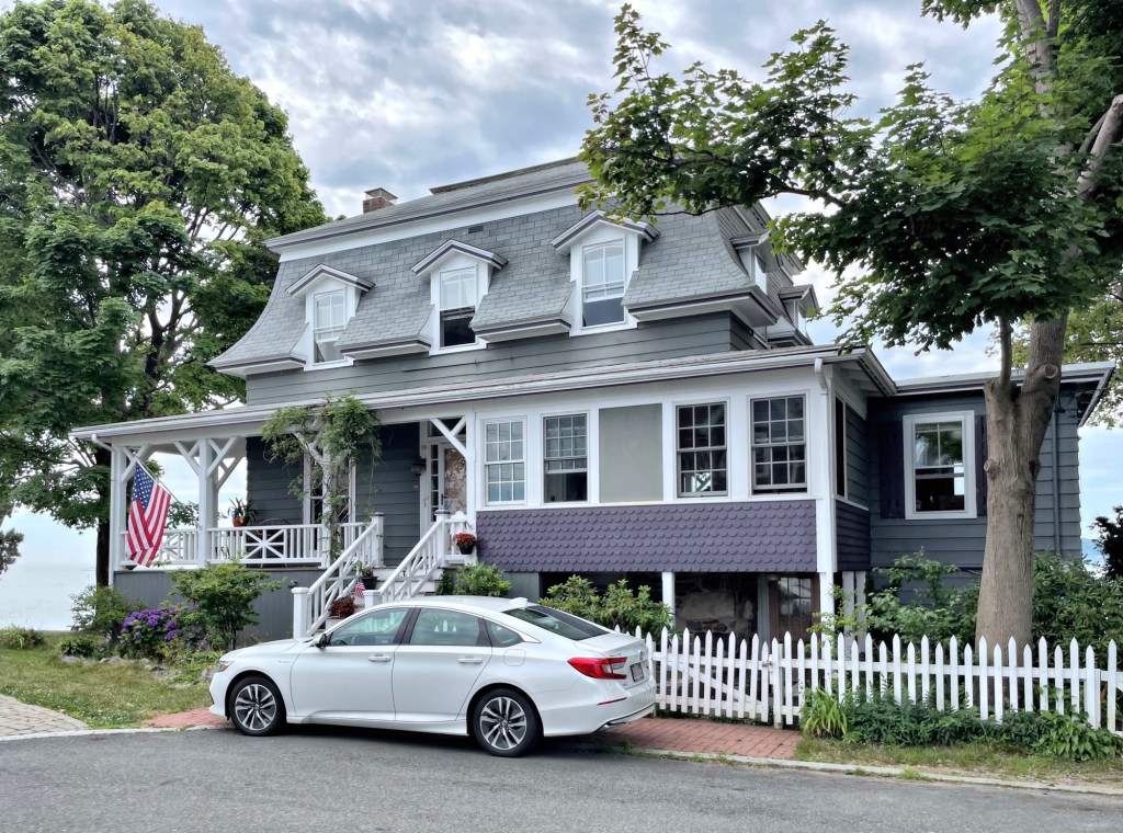 This charming mini-mansard summer cottage is located in the coastal neighborhood of Salem Willows, in Salem, Massachusetts. The neighborhood developed in the 1870s-1900s as a summer colony for middle-income families who wanted a second home away from the hustle-and-bustle of urban living in favor of ocean breezes. The cottage likely dates to the mid-1870s as one of the earliest summer homes in the neighborhood, and historic maps show it was owned by a P. Dempsey. It appears this is Patrick Dempsey (1821-1902), an Irish immigrant who settled in Lowell, Massachusetts, making it big as a liquor dealer and saloon-keeper. The Second Empire style cottage has a partially enclosed porch, but retains much of its original character and is located right on the water with sweeping views of the Atlantic Ocean.