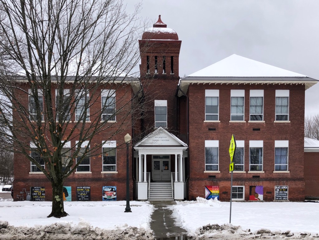 This handsome brick building is located in the historic downtown of Richmond, Vermont, and was built at a time of rapid growth of the small community. Pupils in the town of Richmond originally went to school in small, one-room rural schoolhouses, with the Richmond Academy serving the main village. The old academy building was constructed in 1868 and taught classes from elementary through high school. The building was outgrown as the town grew in the first decade of the 20th century, necessitating a new, larger schoolhouse for the main village. This new school was constructed in 1907, apparently just as the right side and tower, which was expanded with the left half four years later in 1911. Blending Craftsman and Romanesque styles, plans for the school were drawn up by Vermont architect, Frank Lyman Austin. Another rear addition in the 1950s was constructed to meet increased demand until the 1980s when a new elementary school was built in town. Since 1989, the former Richmond School has been home to Richmond town offices. The building, while altered, is an important landmark of the town, showcasing a blending of architectural styles popular in the early 20th century.