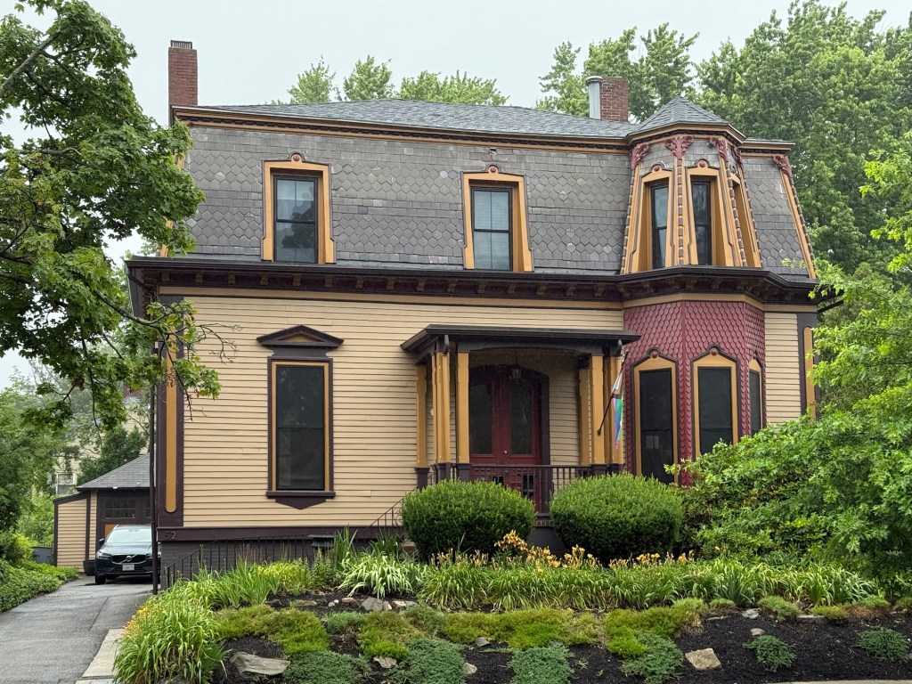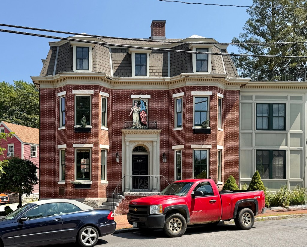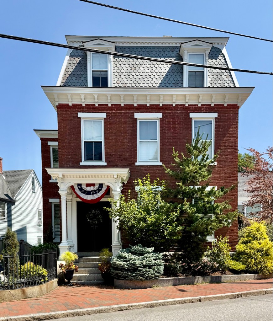 In a town full of clapboards and shingles, brick houses really do stand out! This is the William Fraser House, located at 303 Pleasant Street in the ever-charming town of Portsmouth, New Hampshire, a stately example of the Second Empire style as a single-family residence. The house was built by 1873 for William James Fraser (1836-1930), a Canadian-born mason who immigrated to Portsmouth in 1850 and began a successful career as a mason, building many of the town’s great masonry buildings. The Fraser House has a slate mansard roof with overhanging eaves, bracketed cornice, and paired gable dormers and a double wood-paneled entrance door with transom under a flat roof portico.