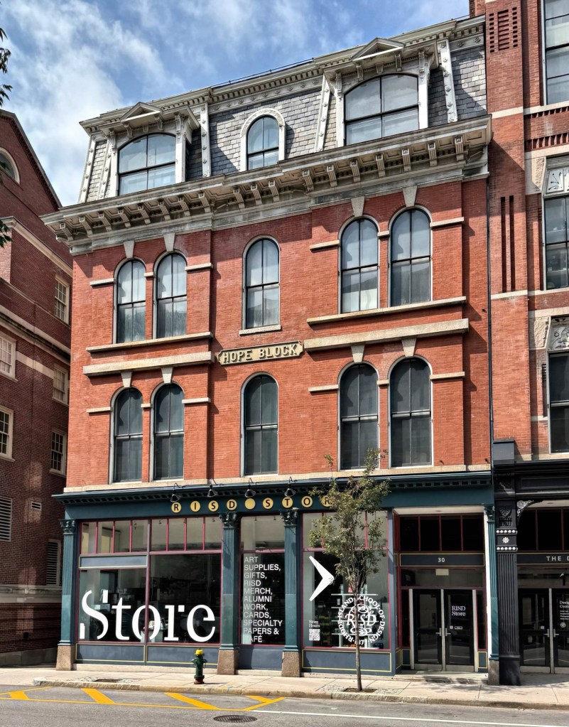 The Hope Block on North Main Street in Providence’s East Side neighborhood is an architecturally significant commercial block in the Second Empire style. The masonry building was constructed in 1869 and is probably designed by architect, Clifton A. Hall, who designed similar buildings in the city around that time. The block was developed by Edward M. Young and Ezra P. Lyon of the firm, Young & Lyon to house their fruit and grocery store, which they operated here from 1870 until 1889. By the latter half of the 20th century, the building was owned by the Rhode Island School of Design, and rehabilitated for classrooms in 1984, even retaining the cast iron storefronts, unique arched windows, and slate mansard roof. Today, the Hope Block houses the RISD Store.