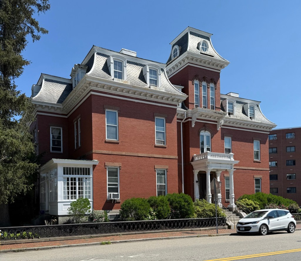 While Portsmouth, New Hampshire, is arguably best-known for Georgian and Federal style houses of the 18th and early 19th centuries, there are some great examples of Victorian style residences built after the Civil War to be discovered. This brick Second Empire style residence on Pleasant Street was built around 1870 and originally owned by Ebenezer Lord (1788-1877), who lived elsewhere in Portsmouth, likely gifting this home to his daughter, Susan (Lord) Colcord, and her husband, Charles Colcord. Both Charles and Susan died one year apart in 1872 and 1873 respectively, and the property was inherited by their son, John. John Edward Colcord worked as the Clerk at the Portsmouth Navy Yard. The building has a Mansard roof with overhanging eaves, denticulated cornice, and three shed-roof dormers at the facade. Walls are brick and rest on a granite foundation, with a later, wood-frame side addition that employs similar design details of the main house.