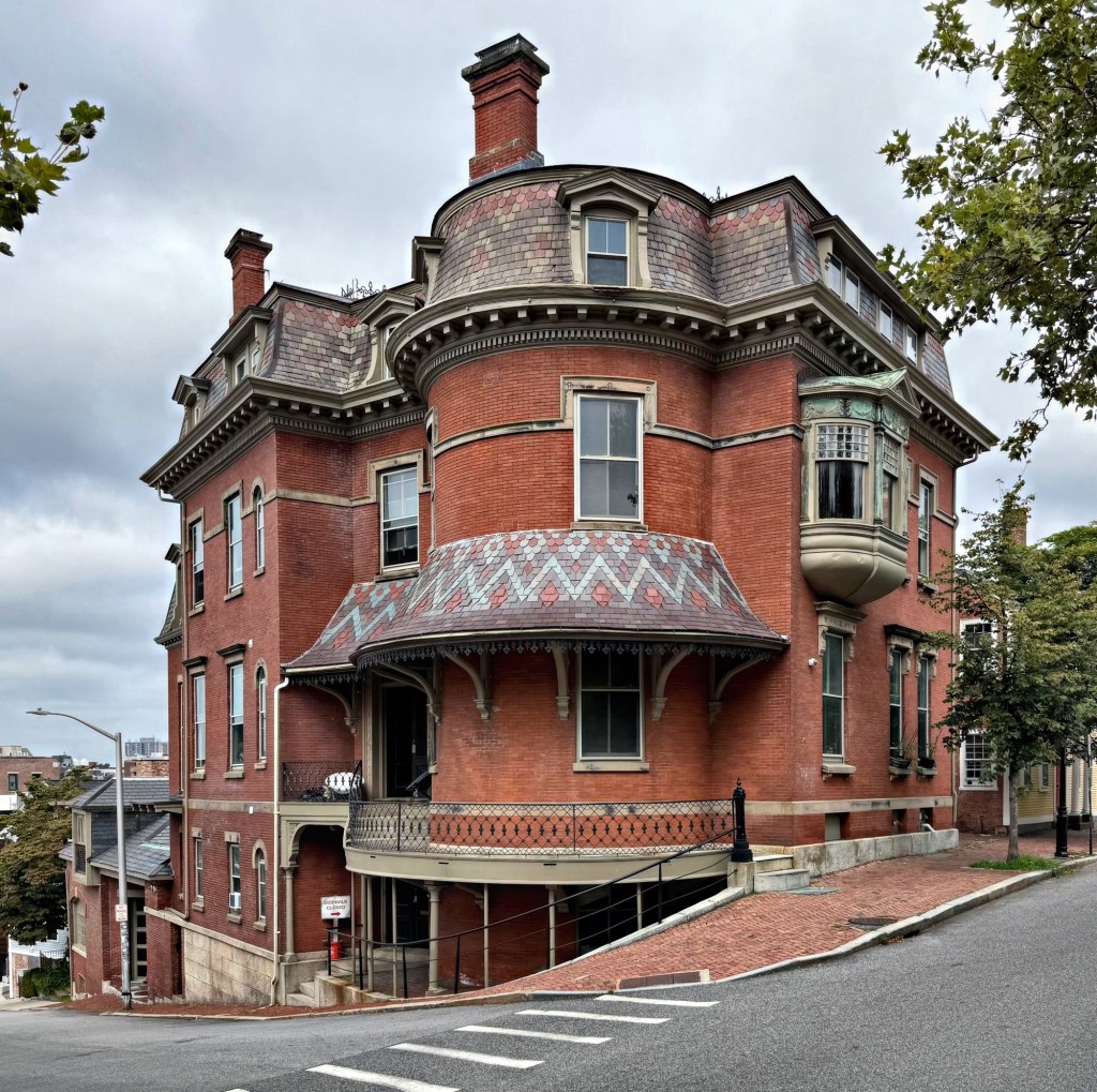 The Ambrose Burnside House is sited on an oddly shaped, and sloping corner lot on Benefit Street in Providence’s East Side neighborhood, and is one of the most unique Second Empire style residences in New England. The house was built in 1866 for General Ambrose Burnside (1824-1881), a Union general in the American Civil War, who returned to Providence and was about to begin a term as governor, followed by two terms in the United States Senate. Ambrose Burnside hired local architect, Alfred Stone, to design his new city mansion, which upon completion, was deemed one of the most “modern residences” in Providence. Built of brick with Nova Scotia stone with a concave slate mansard roof and one-of-a-kind rounded corner bay, the Ambrose Burnside House does not disappoint! Ambrose Burnside died in 1881 and the property was occupied by his sister-in-law until the property was sold in 1884 and housed the Providence Children’s Friend Society House for Aged Women and the Providence Association for the Benefit of Colored Children, providing shelter and food for elderly women and children of color without parents or guardians. After WWII, the Burnside House was converted to apartments.