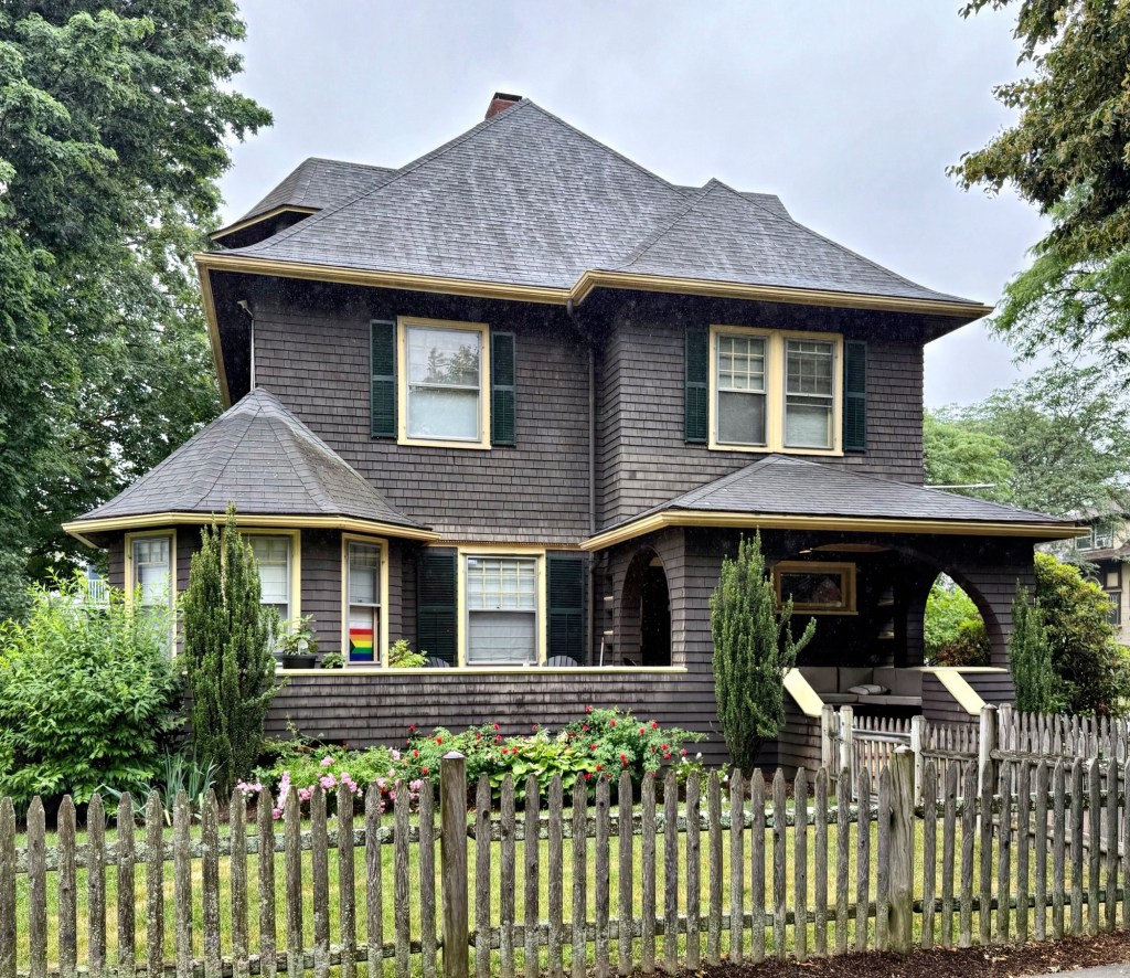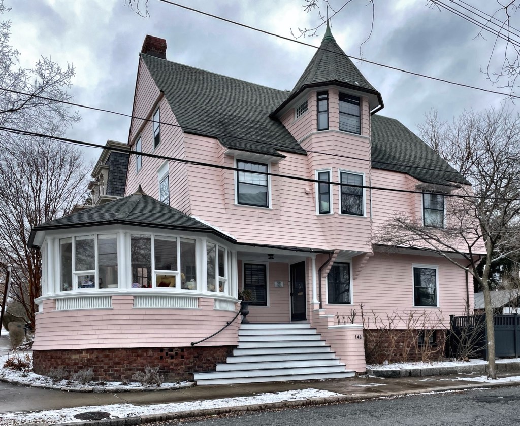 Talk about a statement! This pink, Shingle style house is located at 140 Brown Street in the fashionable College Hill section of Providence, Rhode Island. Built in 1890 for William and Katherine Crandall, the Shingle style residence stands out for its cantilevered two-story tower and corner rounded porch at the corner, and of course the continuous shingled facades. William T. Crandall was the president of the Union for Christian Work, a religious charitable institution which provided aid to needy children in Providence. Augustus R. and Ida W. Peirce would board in the home for decades, and were likely family, inheriting the property upon Katherine’s death in 1932. The architect could not be located.