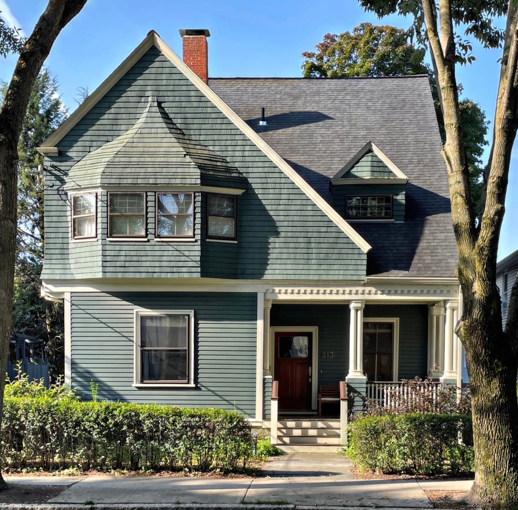 One of the finest and refined examples of the Shingle style in Boston can be found on Alban Street in the Ashmont Hill section of Dorchester, a lovely, walkable neighborhood where you can find timeless examples of just about any Victorian-era architectural style. Built for Charles F. Dillaway, a banker in Boston, this home was designed by local architect, Edwin J. Lewisarchitect for many houses in the Ashmont area.  Lewis’s designs are distinguished by their crisp geometry, often with horizontal lines emphasized and small-paned windows. The house has been slightly modernized by later owners who added new siding within the inset porch and a more moody color scheme.