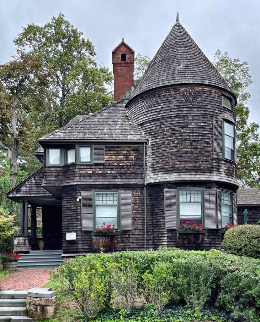 Talk about a statement! This pink, Shingle style house is located at 140 Brown Street in the fashionable College Hill section of Providence, Rhode Island. Built in 1890 for William and Katherine Crandall, the Shingle style residence stands out for its cantilevered two-story tower and corner rounded porch at the corner, and of course the continuous shingled facades. William T. Crandall was the president of the Union for Christian Work, a religious charitable institution which provided aid to needy children in Providence. Augustus R. and Ida W. Peirce would board in the home for decades, and were likely family, inheriting the property upon Katherine’s death in 1932. The architect could not be located.