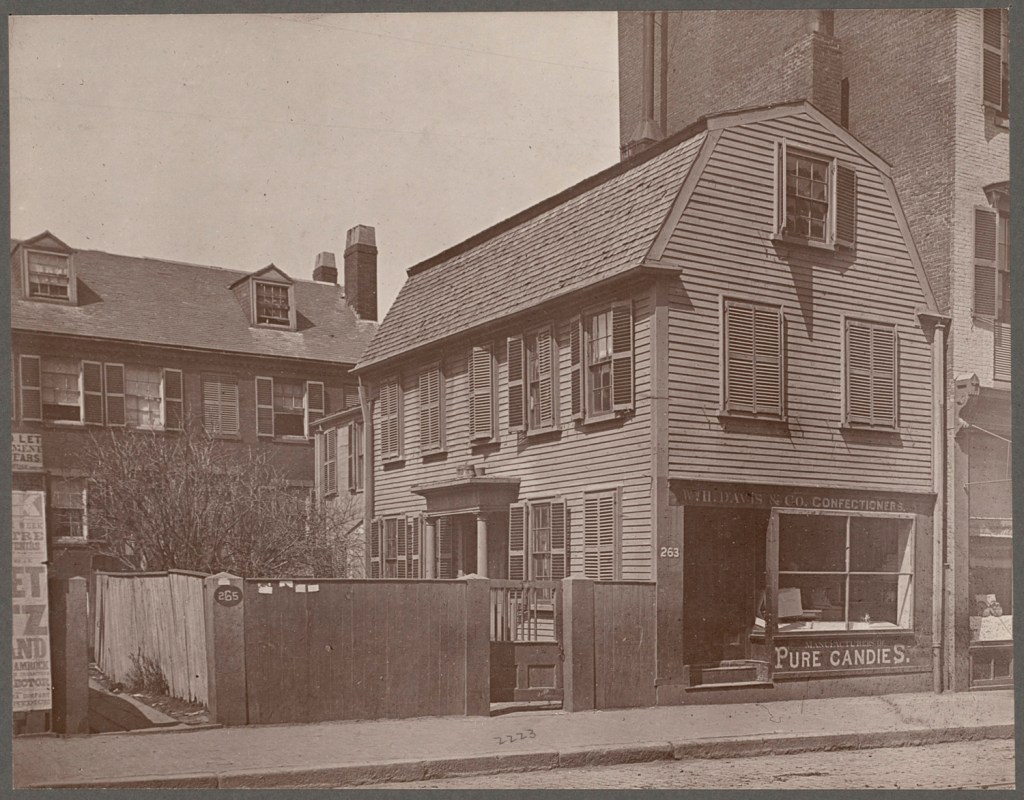 Formerly located on Tremont Street in Downtown Boston, this ca.1670 Georgian gambrel home went from residence to candy shop to billboard in its lifetime. The home was constructed by John Crane (1744-1805), who was a housewright by trade but a patriot and soldier most importantly. At the tender age of 12, he had an early military experience when he substituted for his father in the French and Indian War when his father received the draft. Records state that Crane was an active member the Sons of Liberty, a secret revolutionary organization that was founded by Samuel Adams to fight taxation from the British government. Hours before the Boston Tea Party, Crane and the other participants met at his shop at his home to disguise themselves as American Indians as disguises for the events that would take place that night. He was in the hold of one ship when he was knocked unconscious by a falling crate of tea. His fellow patriots thought him dead and hid him under a pile of wood shavings in a carpenter’s shop off the harbor, only for Crane to recover later. Less than a year later, Crane and his family moved to Providence, Rhode Island where he would later serve under a militia there in the Revolutionary War. After serving, and seeing battle, he was awarded land in Whiting, Maine (Maine was part of Massachusetts at the time) where he built a home and spent his last days.
