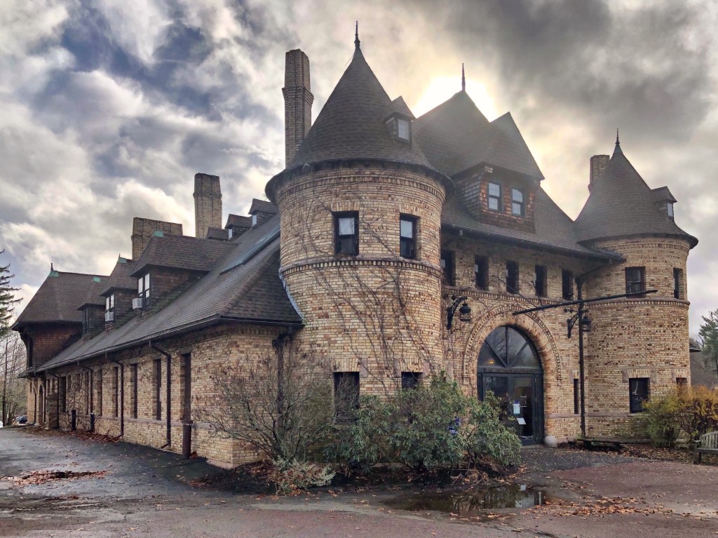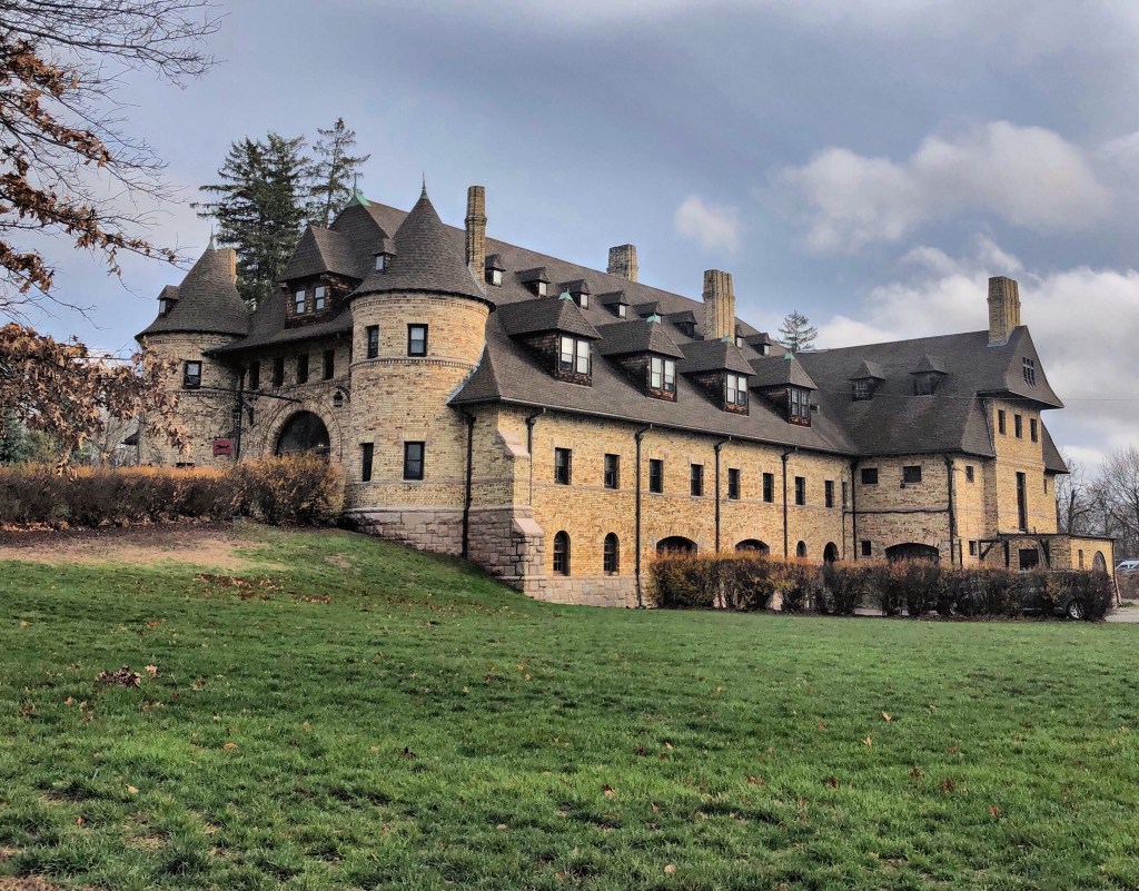 Like the Roughwood Mansion and carriage house, this building was designed and built in Brookline, Massachusetts, in the early 1890s as part of the “Roughwood” estate. Despite its high-style and ornate detailing, the building was actually constructed as a cow barn. Built in two phases for its two owners, William Cox and Ernest Dane, the large barn structure blends Victorian design into a use more reserved for vernacular detailing. The building was designed by Andrews, Jacques and Rantoul, and like the mansion and carriage house, blends Queen Anne and Shingle styles under one roof. Ever-since the estate became a college in the 1960s, the building has been used as a maintenance building. It appears that since it has been owned by Boston College as part of it’s Messina Campus, it is undergoing a thoughtful restoration!