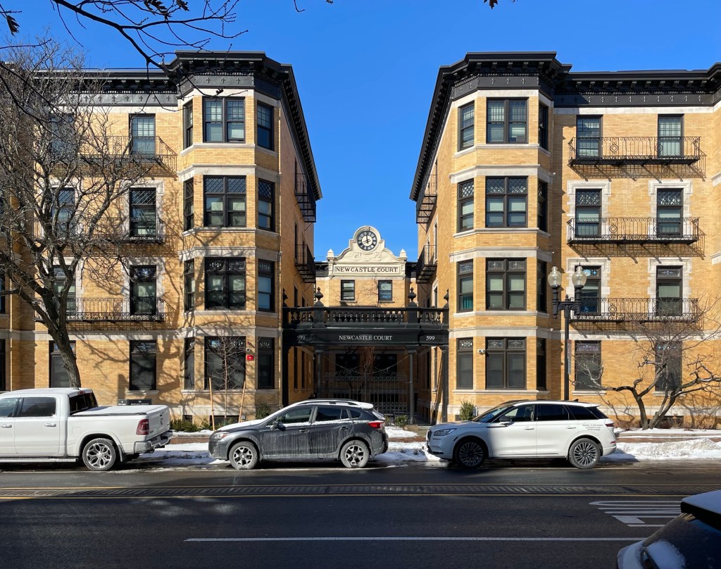 Newcastle Court in Boston’s South End/Lower Roxbury neighborhoods is one of the finest apartment buildings in the city built in the early 20th century. The complex is U-shaped with a central courtyard off Columbus Street, to provide air and natural light in all bedrooms and units of the building. Newcastle Court was built by builder/developer Israel Nesson, who was credited as building the first fireproof apartment building in the city. Nesson and his family built and owned apartment buildings all over Boston and Cambridge, and operated many of them as landlords with massive real estate holdings. Newcastle Court stands out for the garden courtyard set behind the gate. At the back of the courtyard, the building has a raised parapet at the roof, which encompasses a clock. Many of the units retain the original stained glass windows, which are AMAZING!