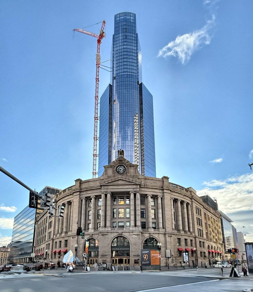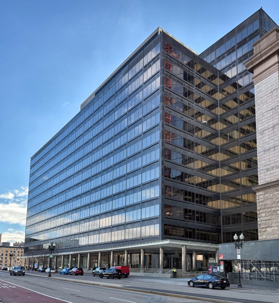 Stone & Webster, established in 1893 by MIT graduates Charles Stone and Edwin Webster, was a national leader in electrification and power generation, and provided services in engineering, construction, environmental remediation, infrastructure, and plant operation for industrial clients. After the Boston Redevelopment Authority acquired and demolished sections of South Station for redevelopment, Stone & Webster decided to relocate their offices to this new site. Los Angeles-based architectural firm Welton Becket & Associates, designed the office building in a late International-style, which serves as a counter to the masonry and classically designed, South Station nearby. The steel frame with metal and glass skin and boxy form are effective at delineating the building from its neighbor, but is not pedestrian-friendly at the ground level as the raised ground floor is lined at the sidewalk by concrete steps. The building is now largely leased to Fidelity Investments.