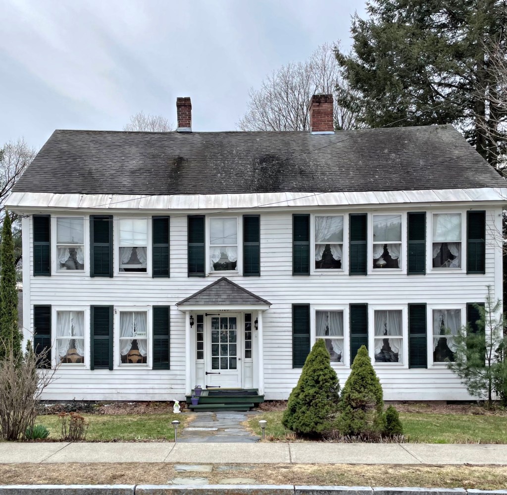 The main part of this stunning Greek Revival house in Whitingham, Vermont was built by Reuben Winn around 1840 and was originally located on the town common, southeast of the present village of Whitingham. The building was the only one to be moved from the hill to the valley as development shifted westward to the current town center and its access to water power for industry. This house was moved in 1889 and was run as the Sadawga Lake House hotel by Charles E. Putnam who also was listed in local directories as a slate dealer. The present slate roof was likely added by Putnam! The architectural element which stood out to me was the three part Palladian window directly above the front door that uses the motifs of the Greek Revival pilasters and entablature common to the other façade elements. The home is very well-preserved and even maintains a detached barn on the property!