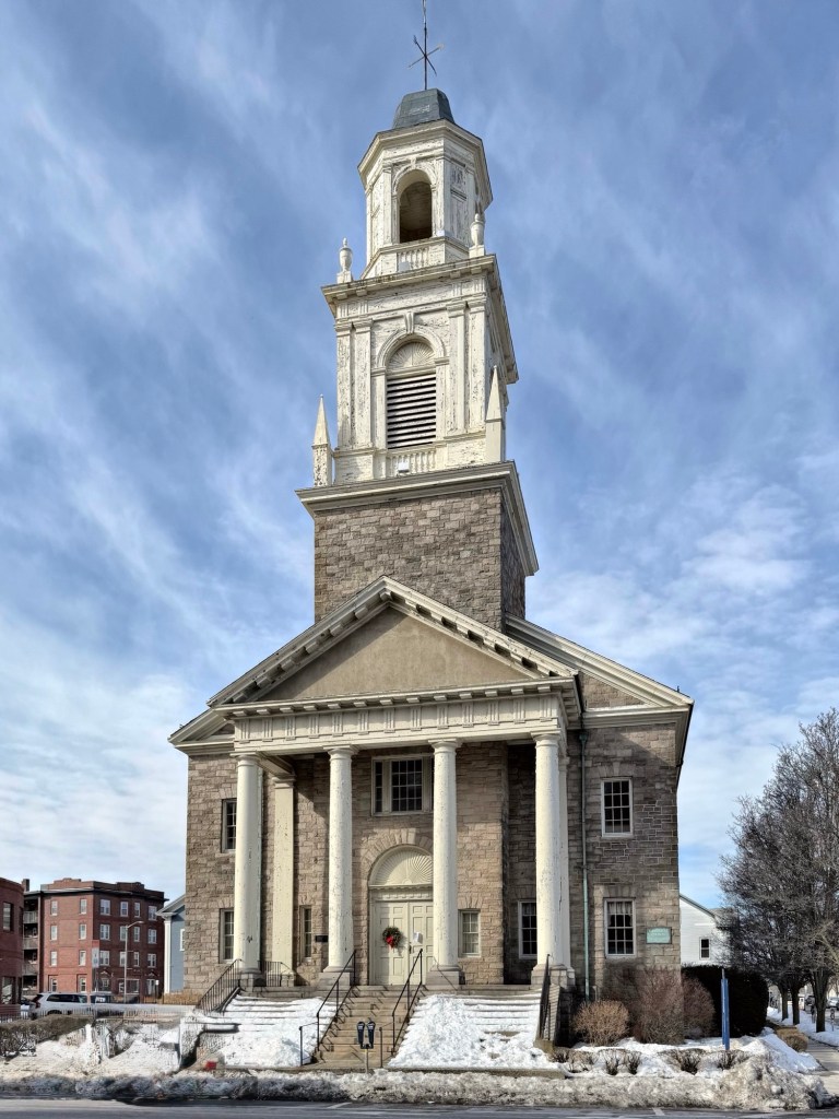 The Tabernacle Congregational Church at Washington and Federal streets in Salem, Massachusetts, was built in 1923 for one of the oldest congregations in the Commonwealth. The Tabernacle Church’s congregation traces its origins to the founding of the First Church of Salem in 1629. The church was originally located a few blocks away until a fire destroyed the wooden building in 1774. The congregation built a new wooden church on this site by 1777, and have remained on the site ever since the United States was established. The present, stone church building, was constructed from designs by the Boston firm of Philip Horton Smith and Edgar Walker in 1922. This dignified and graceful Colonial Revival church building (with attached parish house) is the third ecclesiastical structure to stand on this site. It replaced a large wooden Italianate church which the parish occupied from 1854 until it was torn down in 1922. Its predecessor, which stood from 1776 to 1854, possessed an elegant three-stage tower which Samuel McIntire added in 1805. The Tabernacle Church is a stone-veneered masonry building with a prominent engaged tower which contains a large arched entry, and a giant order porch consisting of four Tuscan columns and associated pilasters of the same type, which supports a pedimented roof that shelters the entrance. The tower is surmounted by a square, wood-frame belltower with pilastered corners above which is an open octagonal cupola with bell-cast roof. What a great Colonial Revival style church!