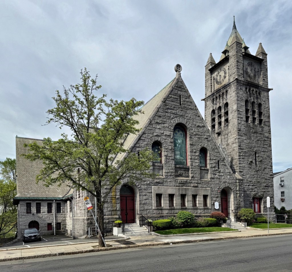 Located on Highland Avenue in the Central Hill section of Somerville, Massachusetts, the First Unitarian Church of Somerville is a landmark example of a church in the Romanesque Revival style. The church was built in 1895 from plans by the esteemed architectural firm of Hartwell & Richardson, and was the fourth and final building of the congregation, which was originally established in 1844. The congregation’s first church was a Gothic Revival style building designed by Richard Bond, but was destroyed by fire in 1852. A year later, the second edifice was designed and built by architect Thomas W. Silloway, which also burned in 1867. The church was replaced again by a Romanesque style structure in 1869. In the 1890s, when the City of Somerville purchased the building as part of the site for the new Somerville High School, a lot down Highland Avenue was secured and planning began for this building. The church is built of granite block with a steeply pitched gable roof, and a square tower at its right front corner. The prominent gable contains two arched entrances with a bank of five rectangular stained-glass windows below three tall round-arch stained glass windows. The congregation was dissolved in 1975 and a year later, the building was purchased by the Mission Church of Our Lord Jesus Christ, an Apostolic Pentacostalist church, who continue to use the building today.