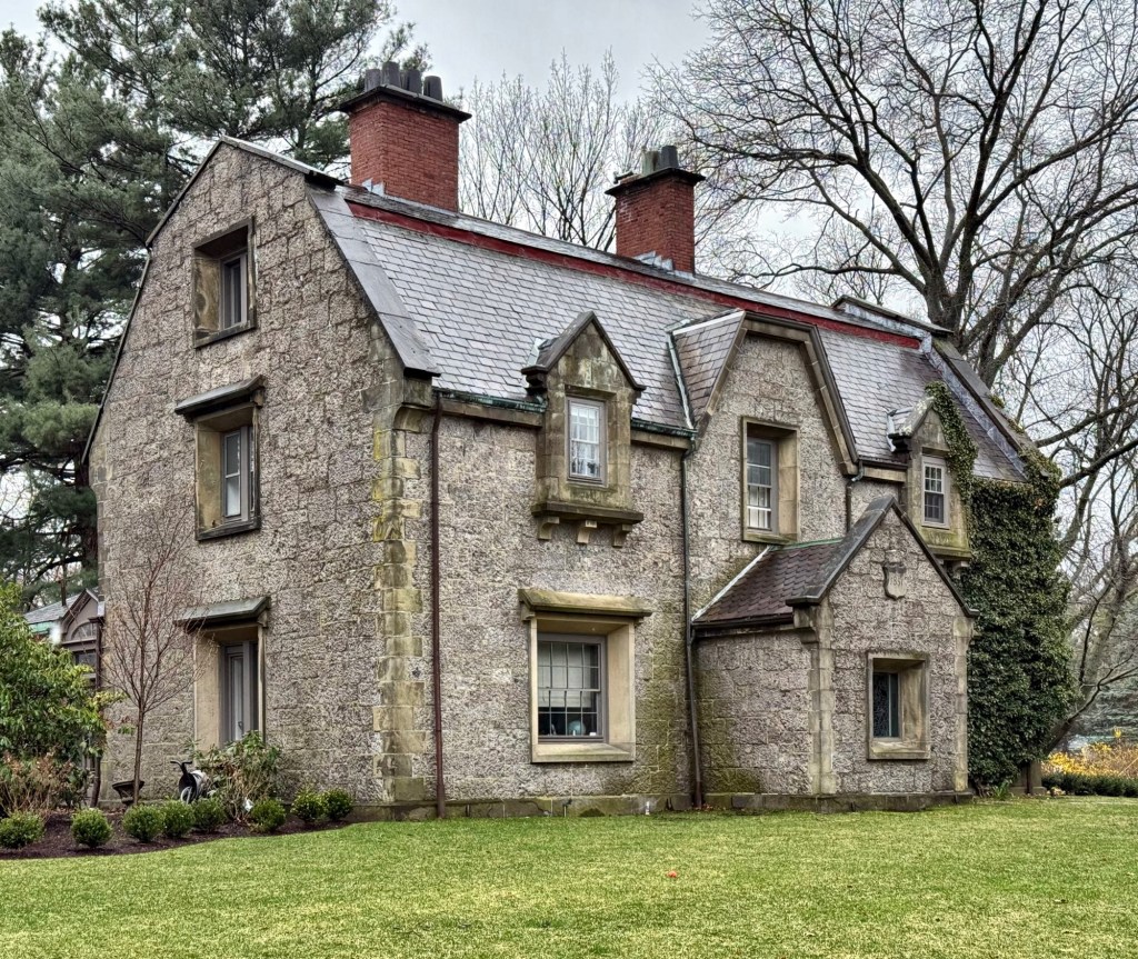 The Frederick Sears Cottage in the Cottage Farm neighborhood of Brookline, Massachusetts, is significant as one of the major surviving examples of Gothic Revival domestic architecture in the Boston area. In 1849, wealthy Bostonian, David Sears (1787-1871) laid out parks and squares in the Cottage Farm neighborhood, and built houses for himself and his children. His own house, erected in 1843, was the oldest, soon followed by houses for his four daughters, Ellen d’Hautville, Harriet Crowninshield, Anna Amory, Grace Rives, and son, Frederick. The Frederick Sears Cottage is the only surviving Sears residence in the Cottage Farm neighborhood. Frederick Sears‘ cottage was built in 1851, though he did not occupy the house long, as just three years after he and his wife married in 1852 to move into this home, Marian died. The house was inherited by Frederick Sears Jr. , and was acquired by Boston University in 1960, who began to expand into this neighborhood. They maintain the significant property very well. The Sears Cottage is an excellent example of the Gothic Revival style in stone with scalloped vergeboards, quatrefoil motifs, corner quoins, and projecting entry. The house is constructed of Roxbury Puddingstone and is said to have been designed by George Minot Dexter.