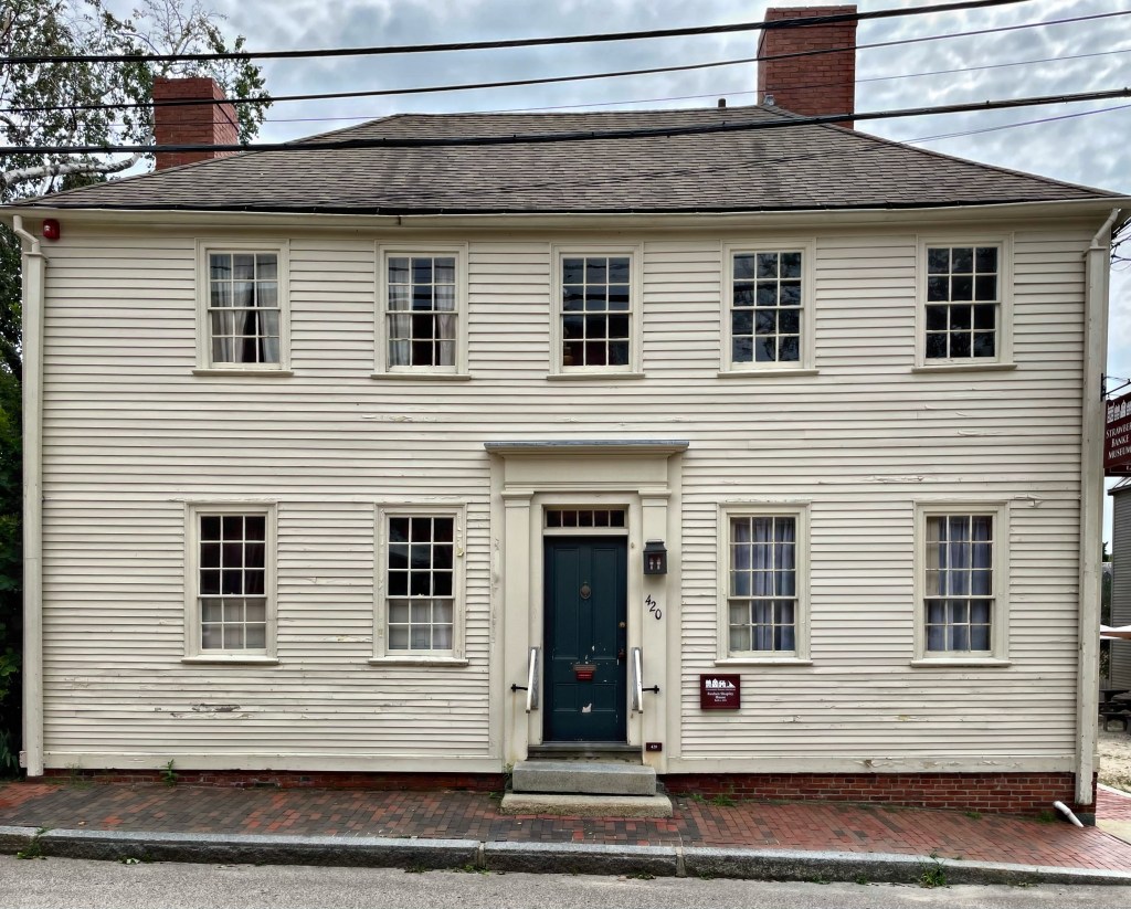 The Jefferson House and Stores on Marcy Street sits near the working port and harbor of Portsmouth, New Hampshire, as a historic Federal style mixed-use building. The structure dates to the early 19th century and consists of a brick first floor and clapboarded upper stories. Likely due to coastal flooding during storms, the brick ground floor with slightly raised granite foundation would provide some relief from floodwaters getting inside the building. The shortened windows at the third floor, fanlight over the main entrance, and form with shallow hipped roof, are all hallmarks of the Federal style. The building is today owned by Strawbery Banke and rented out to the Gundalow Company, a non-profit that seeks to, “protect the Piscataqua Region’s maritime heritage and environment through education and action.”