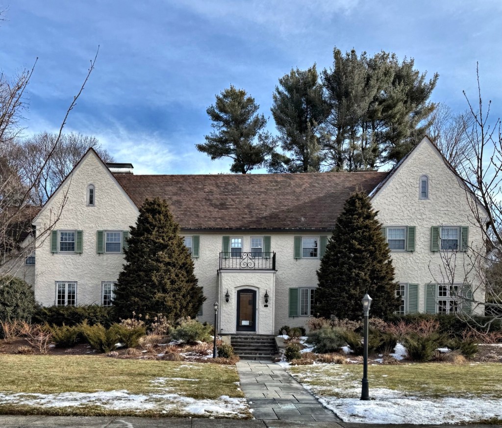 Built in 1911, this Colonial Revival style house rendered in stucco, is located at 28 Hawthorn Road in the Pill Hill neighborhood of Brookline, Massachusetts. The residence was built for William Marshall Warren (1865-1953) and his wife, Sara Shields Warren (1874-1964) from plans by the firm of Gay & Proctor. William M. Warren served on the faculty at Boston University as Professor of Philosophy and later as Dean of the College of Arts and Sciences, promoted by his father, William Fairfield Warren, who was President of the University. The Warren House features a symmetrical five-bay facade with central entrance within a projecting pedimented vestibule framed by four pilasters. The pilasters are replicated in the three dormers at the roof, set below the central chimney.